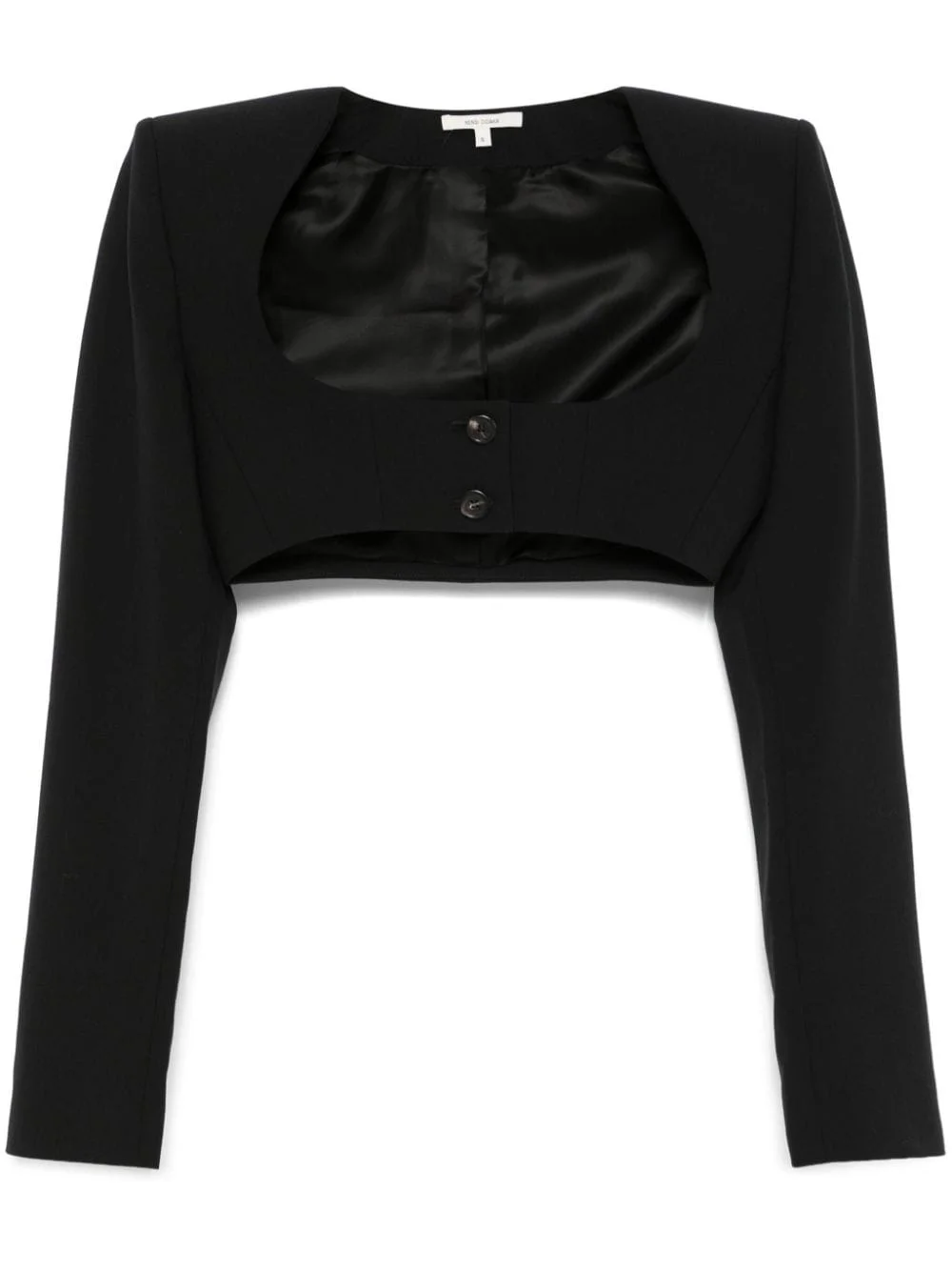 cropped jacket Highlights - Black - Cropped - Front button fastening - Scoop neck - Shoulder pads - Long sleeves - Buttoned cuffs - Full lining - Straight hem Made in Italy Composition Polyester 53%, Virgin Wool 43%, Elastane 4% SIZE & FIT Model measurements Height 5 ft 9 in(1.75 m) Bust/Chest 31.88 in(81 cm) Hips 34.64 in(88 cm) Waist 24.01 in(61 cm) FittingInformation Designed for a slim fit that sits just away from the body offering a close yet comfortable fit The internal shoulder pads offer a structured shape Made from a midweight fabric