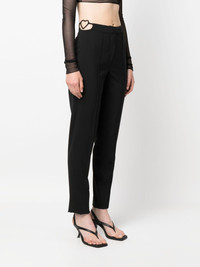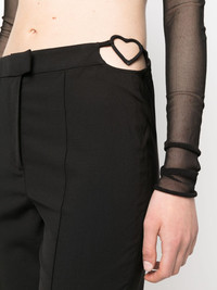 cut-out detailing slim-fit trousers These virgin wool trousers from Nensi Dojaka arrive in a tailored silhouette. Injecting its signature playful finish, the pair boasts heart cut-outs at the sides. Highlights - Black - Virgin wool blend - Stretch-design - Cut-out detailing - Heart cut - Mid-rise - Pressed crease - Concealed front fastening - Rear button-fastening jetted pocket - Slim cut Made in Italy Composition Virgin Wool 98%, Elastane 2% SIZE & FIT Model measurements Height 5 ft 11 in(1.8 m) Bust/Chest 31.49 in(80 cm) Hips 36.41 in(92.5 cm) Waist 25.59 in(65 cm) FittingInformation Designed for a slim fit, these trousers offer a close fit at the waist, allowing a comfortable close fit and some movement over the leg Made from a midweight stretch fabric, this piece offers elasticity and flexibility when worn This piece fits true to size – take your usual size Washing instructions Dry Clean Only