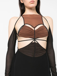cut-out mini dress An exemplar of Nensi Dojaka's penchant for challenging the conventions of femininity, this mini dress pairs two brand signatures: cut-outs and mesh. In black and 'Chestnut' brown, it's made from stretch silk and cut to a thigh length. Made in Italy Composition Silk 88%, Spandex/Elastane 12% SIZE & FIT Model measurements Height 5 ft 10 in(1.78 m) Bust/Chest 31.49 in(80 cm) Hips 36.22 in(92 cm) Waist 25.59 in(65 cm) Measurement HIPS 31.49 in(80 cm) LENGTH 33.85 in(86 cm) WAIST 23.62 in(60 cm) FittingInformation This piece fits small – you might want to get one size up Cut for a close fit Made with a mid-weight stretch fabric Washing instructions Dry Clean Only