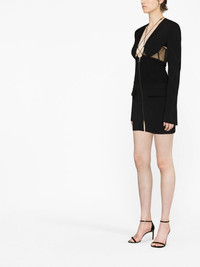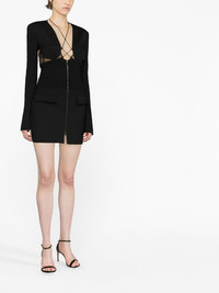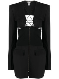 cut-out wool minidress This minidress spotlights Nensi Dojaka’s penchant for clean lines that ‘create a graphic play on the body’. Tailored from a wool blend, it’s detailed with mesh panels and slender straps at the front and back, evoking the brand’s lingerie inspiration. Highlights - Black - Virgin wool blend - Cut-out detailing - Mesh panelling - Plunging u-neck - Front zip fastening - Long sleeves - Two front flap pockets - Straight hem Made in Italy Composition Outer: Virgin Wool 98%, Spandex/Elastane 2% Lining: Viscose 100% SIZE & FIT Model measurements Height 5 ft 10 in(1.77 m) Bust/Chest 32.67 in(83 cm) Hips 37 in(94 cm) Waist 27.55 in(70 cm) FittingInformation Designed for a slim fit that sits just away from the body offering a close yet comfortable fit The internal shoulder pads offer a structured shape Made from a midweight stretch fabric, this piece offers elasticity and flexibility when worn This piece fits true to size – take your usual size Washing instructions Dry Clean Only