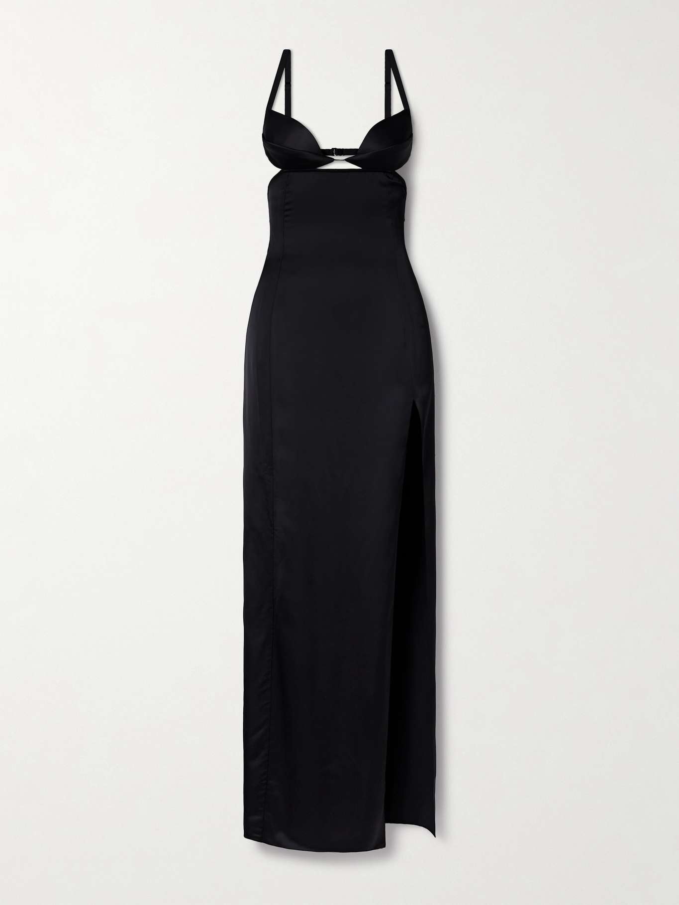 EDITORS'NOTES Nensi Dojaka's gown is defined by the signature cutouts and gathered cups seen throughout the label's alluring collections. It's made from fluid satin and has a deep side split that reveals a flash of skin. Perfect the fit by adjusting the slim straps. SIZE & FIT Model measurements: - Fits true to size, take your normal size - Designed for a slim fit - Partially adjustable shoulder straps - Elasticated at the waist for a flexible fit - Lightweight, non-stretchy fabric - Model is 175cm/ 5'9" and is wearing a size Small - Bust: 79cm/ 31” - Waist: 61cm/ 24” - Hip: 88cm/ 34.5” DETAILS & CARE - Black satin - Concealed hook and zip fastening at back - 93% viscose, 7% elastane - Specialist clean