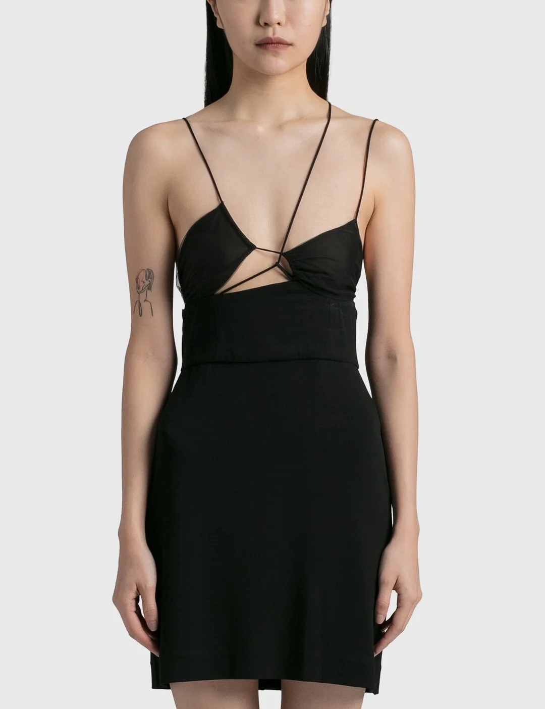 - Nensi Dojaka - Fitted Bra Mini Dress - Adjustable shoulder strap - Semi-sheer bra top - Rear zip fastening - Mini-length - Color: Black - Material: 92% Viscose, 8% Elastane - See more Dresses and Clothing SIZING - Model wears size S - Model measures: Height 170cm, Chest 29”/75cm, Waist 22”/57cm, Hip 33”/86cm