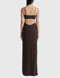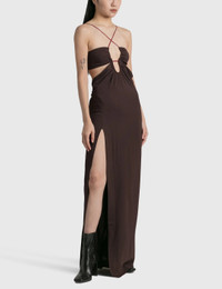 - Nensi Dojaka - Front Key-Hole Floor Length Dress - Barely there cross shoulder strap - Key hole detail at center - Deep side slit - Rear zip fastening - Maxi length - Color: Chocolate - Material: 95% Viscose, 5% Elastane - See more Dresses and Clothing SIZING - Model wears size XS - Model measures: Height 170cm, Chest 29”/75cm, Waist 22”/57cm, Hip 33”/86cm