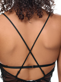 NENSI DOJAKA top in black, stretch nylon mesh, silk crepe, gathered elasticized jersey trim, layered construction, adjustable & detachable spaghetti straps, press-stud fastening at bottom, back hook eye fastening, fitted. Made in Italy Standard Sizing Body - 82% Polyamide, 18% Elastane Second - 88% Silk, 12% Elastane Model is 5'10" wearing size XS. Bust: 34" Waist: 25" Hip: 35"
