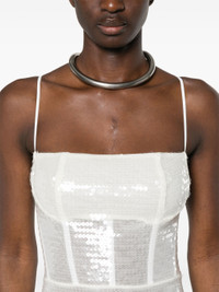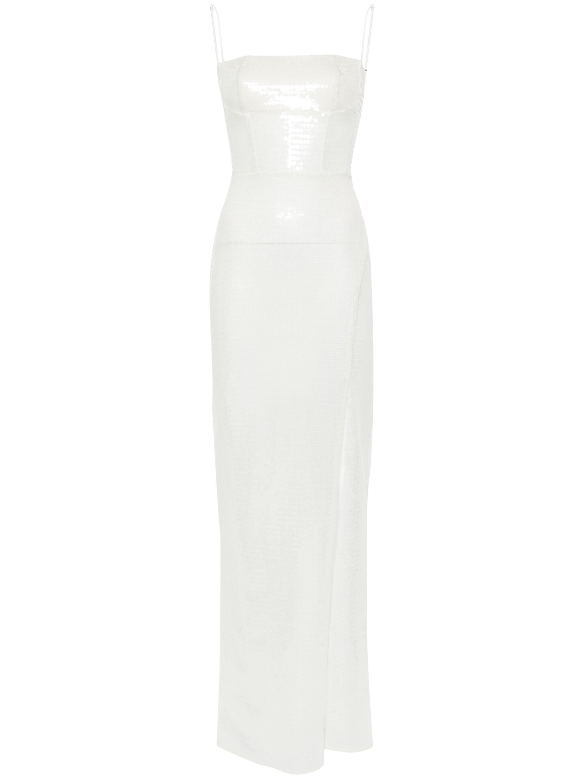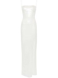 white mesh design sequin embellishment semi-sheer construction square neck adjustable spaghetti straps sleeveless side slit concealed rear zip fastening floor-length straight hem mesh lining corset style Size & Fit Model Measurements: Bust: 0cm Height: 0cm Hips: 0cm Waist: 0cm
