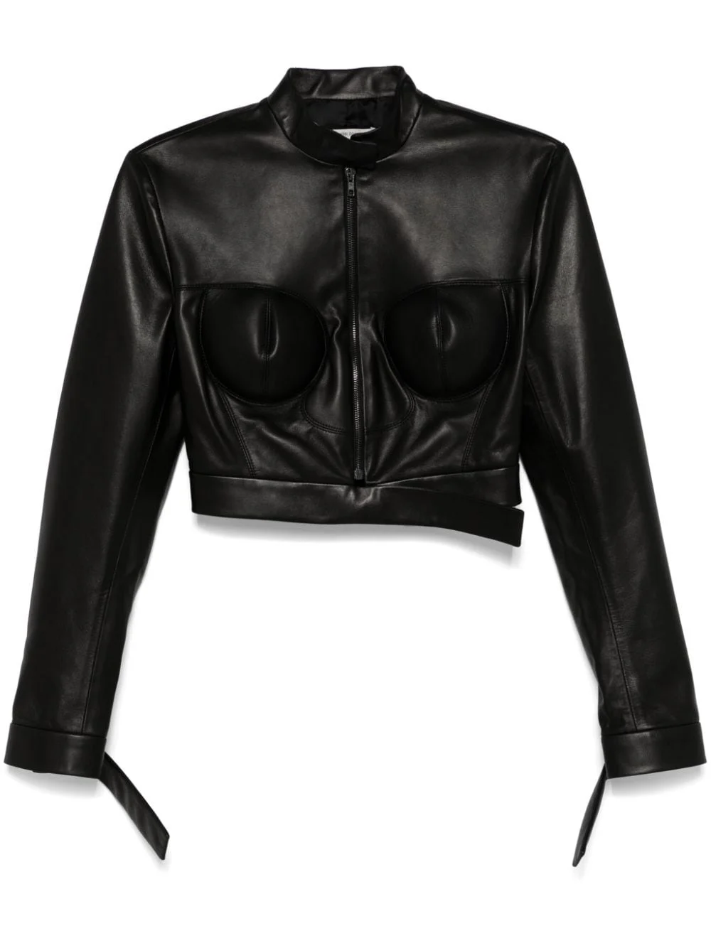 leather jacket Highlights - Black - Calf leather - Front press-stud and zip fastening - High neck - Moulded cup - Long sleeves - Press-stud fastening cuffs - Full lining - Straight hem - Cropped Made in Italy Composition Calf Leather 100%, Viscose 68%, Polyamide 27%, Elastane 5% SIZE & FIT Model measurements Height 5 ft 9 in(1.75 m) Bust/Chest 31.88 in(81 cm) Hips 34.64 in(88 cm) Waist 24.01 in(61 cm) FittingInformation Designed for a slim fit that sits just away from the body offering a close yet comfortable fit Soft leather has a supple and smooth construction offering some flexibility