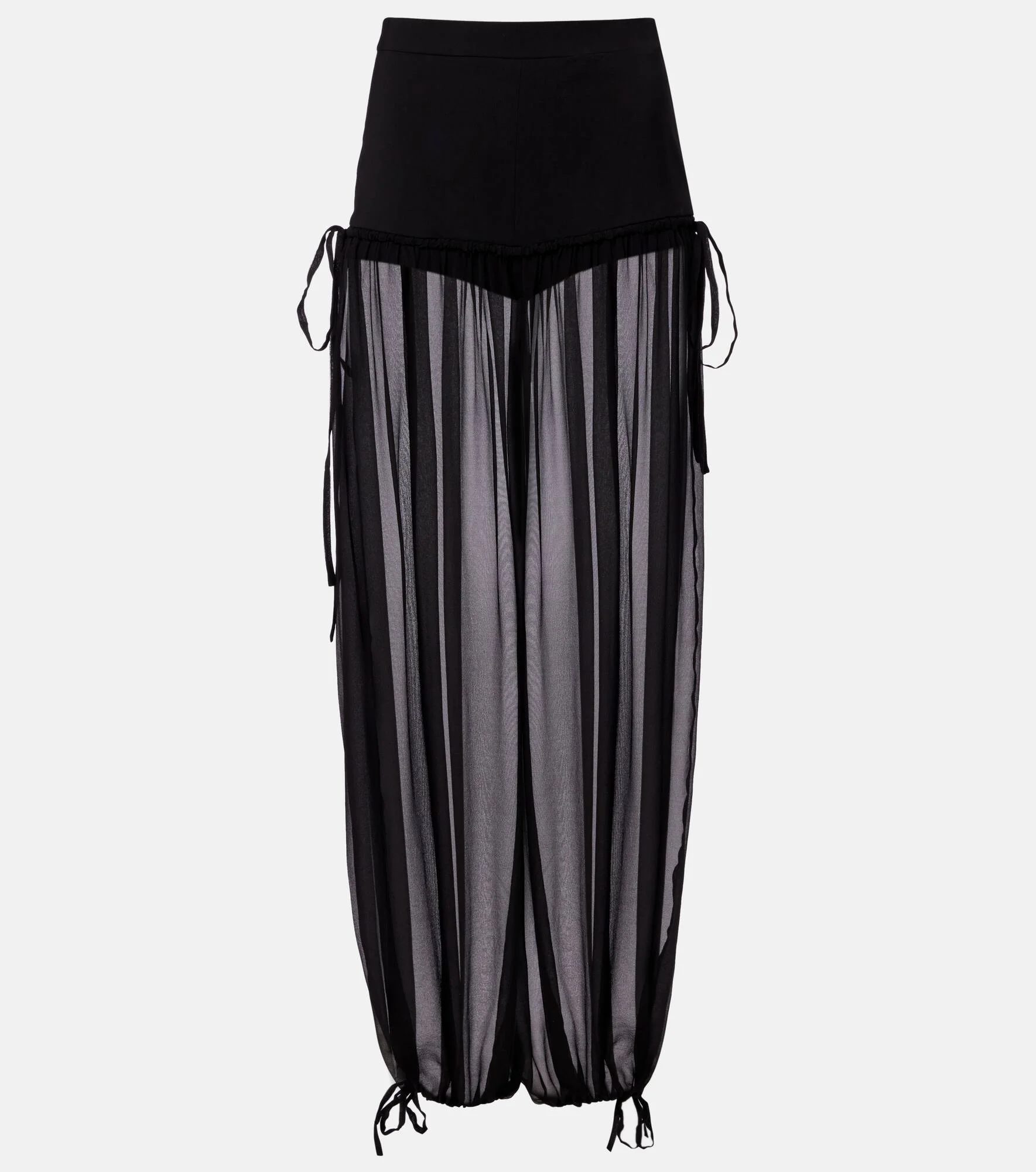 Alluring cutouts and intricate networks of straps have become synonymous with Nensi Dojaka's designs. Featuring a silk upper section, these striking pants showcase ethereal sheer legs in a voluminous balloon silhouette, complete with drawstring ties at the sides and hems. Product Details - Material: 100% silk - Care instructions: dry clean - Made in Albania - Color: black - Designer color name: Black - Item color: black - Material II: 53% polyester, 43% wool, 4% elastane - Closure: concealed zipped side - Drawstring ankle cuffs - Item number: P01139651 Size & Fit - Fits small to size - we recommend trying one size larger - Non-stretchy fabric - Tapered leg - The model seen in the picture is 178cm-5'10" and wearing a size S