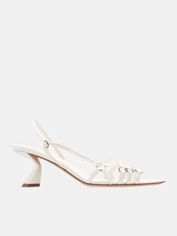 NENSI DOJAKA shoes in white, heeled sandal design, leather construction, open strap style, silver-tone buckles, sculpted heel, pointed toe, rubber-injected heel. Made in Italy Upper: 90% Lambskin 10% Satin Lining: 100% Goatskin Sole: 100% Cow Leather European Sizing