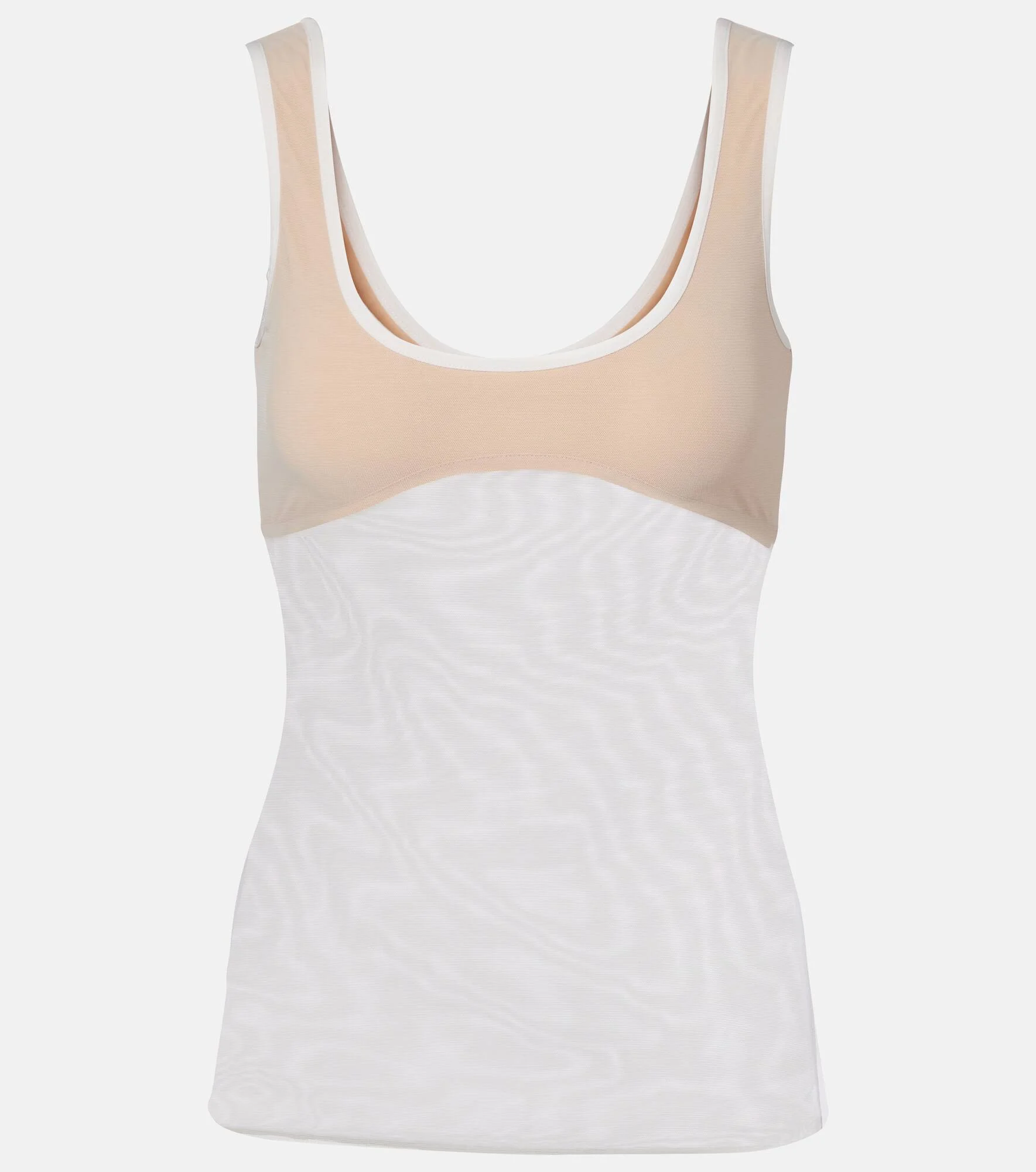 This tank top from Nensi Dojaka has a semi-sheer design with opacity at the bust. The fitted piece has a deep scoop neckline to accentuate its many rounded lines. Product Details - Material: 84% polyamide, 16% elastane - Care instructions: dry clean - Made in Albania - Color: beige - Designer color name: White - Item color: white - Material II: 75% other fibers, 25% elastane - Item number: P01139655 Size & Fit - Fits small to size - we recommend trying one size larger - Semi-sheer - Fitted - Slightly stretchy fabric - Falls to the hip - The model seen in the picture is 178cm-5'10" and wearing a size S