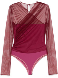tulle bodysuit Highlights - Burgundy - Press-stud fastening - Partial lining - Ruched detailing - Just a reminder that this piece must be tried on over your own garments. Made in Italy Composition Polyamide 84%, Elastane 16% SIZE & FIT FittingInformation Designed for a close fit throughout Made from a midweight stretch fabric, this piece offers elasticity and flexibility when worn