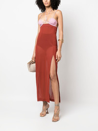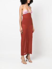 strappy sheer dress Lingerie-inspired silhouettes and sheer fabrics are synonymous with Nensi Dojaka's creations, as illustrated by this maxi dress for SS23. In a soft pink and rust red colourway, this semi-sheer construction is enhanced with delicate straps that outline two moulded bra cups and secure the garment by the neck. Made in Italy Composition Cotton 100% SIZE & FIT Model measurements Height 5 ft 10 in(1.78 m) Bust/Chest 33.07 in(84 cm) Hips 36.61 in(93 cm) Waist 24.8 in(63 cm) FittingInformation This piece fits true to size. We recommend you get your regular size Designed for a close fit at the bust, waist and hips Made with a lightweight non-stretch fabric