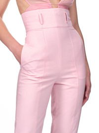 Nensi Dojaka trousers in pink, super high rise waist, belt loops, tonal side zip closure, back pockets featuring contrasting button fastenings, tapered leg silhouette. Made in the United Kingdom. Standard Sizing. Model is 5ft 11” and is wearing a size S. Bust: 33” Waist: 24” Hip: 35"
