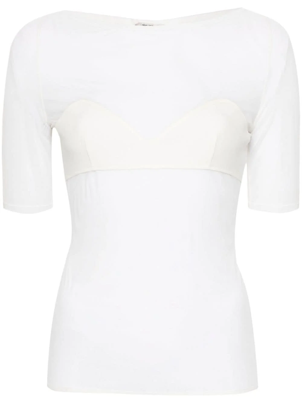triangle-bra jersey T-shirt Highlights - White - Mesh design - Sheer - Triangle-bra panel - Grosgrain ribbon trim - Crew neck - Short sleeves - Straight hem - Unlined Made in Italy Composition Polyamide 84%, Elastane 16% SIZE & FIT Model measurements Height 5 ft 9 in(1.74 m) Bust/Chest 34.64 in(88 cm) Hips 36.61 in(93 cm) Waist 26.37 in(67 cm) FittingInformation Designed for a close fit throughout Made from a lightweight stretch fabric, this piece offers elasticity and flexibility when worn This piece fits true to size – take your usual size