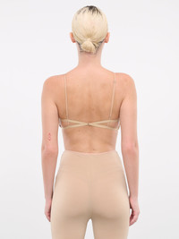 NENSI DOJAKA beige top, bra design, sheer tulle, appliqué details, adjustable spaghetti straps, criss-cross back, fitted. Standard Sizing Model is 5'9" wearing size XS. Bust: 32" Waist: 24" Hips: 34"