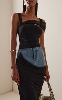 Albanian-born Nensi Dojaka established her namesake label shortly after graduating from Central Saint Martins in 2019. With a distinctive brand aesthetic, you'll find quality fabrics, feminine cutouts, and lingerie-inspired silhouettes. This square-neck bodysuit is made from soft, stretchy jersey that's ruched at the wait to flatter your figure. It's topped with tulle straps that drape over the shoulder and cross at the back. PRODUCT DETAILS - Fall '25 - Snap fastening - Composition: 92% viscose, 8% elastane; Contrast: 84% polyamide, 16% elastane - Dry clean - Imported