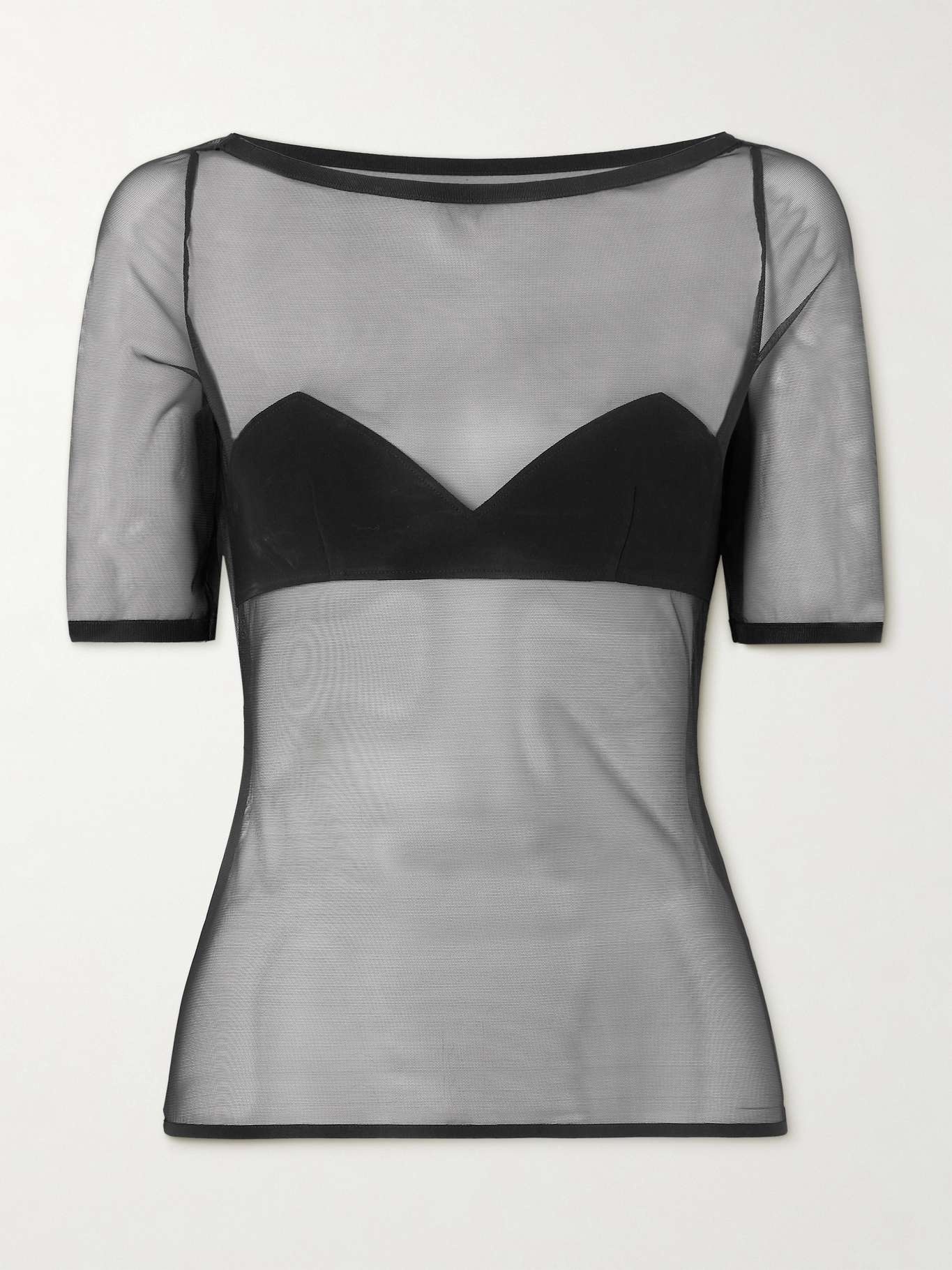 EDITORS'NOTES Nensi Dojaka's recent collections evoke the spirit of '90s minimalism. This top is made from sheer tulle and detailed with a crepe triangle bra for coverage around the bust. Style yours with a black skirt and a smoky eye. SIZE & FIT Model measurements: - Fits true to size, take your normal size - Designed for a close fit - Lightweight, stretchy fabric - Model is 175cm/ 5'9" and is wearing a size Small - Bust: 81cm/ 32" - Waist: 64cm/ 25" - Hip: 89cm/ 35" DETAILS & CARE - Black tulle and crepe - Slips on - Fabric1: 84% polyamide, 16% elastane; fabric2: 83% viscose, 12% polyamide, 5% elastane
