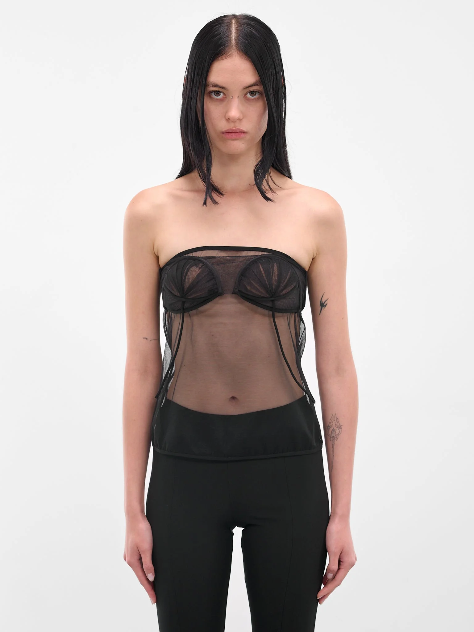 This Upside Down Pleated Bra Top in black introduces a relaxed silhouette in sheer fabric, featuring a straight, strapless neckline with sculptural pleating and a back clasp with cut-out. Featuring: • Relaxed fit • Straight strapless neckline • Sheer fabric • Pleated and structured bust • Back clasp and cut-out • Made in Italy • Main: 84% Polyamide 16% Elastane | Contrast: 100% Polyamide • Italian/Standard sizing Model is 5'8" wearing size 40/S. Bust: 28.5" Waist: 22.5" Hips: 33.5"