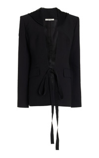 Albanian-born Nensi Dojaka established her namesake label shortly after graduating from Central Saint Martins in 2019. With a distinctive brand aesthetic, you'll find quality fabrics, feminine cutouts, and lingerie-inspired silhouettes. Cut from wool suiting twill, this tie-front blazer features sharply padded shoulders and a chiffon scarf. Try it over a matching mini. PRODUCT DETAILS - Spring '24 - Tie fastening at front - Composition: 53% polyester, 43% virgin wool, 4% elastane; Contrast: 100% polyester - Dry clean - Made in Italy SIZE & FIT - Our model is wearing a size Small - Model is 5'10" with a 31" bust, 23.5" waist, and 33.5" hip - Designed for a slim fit