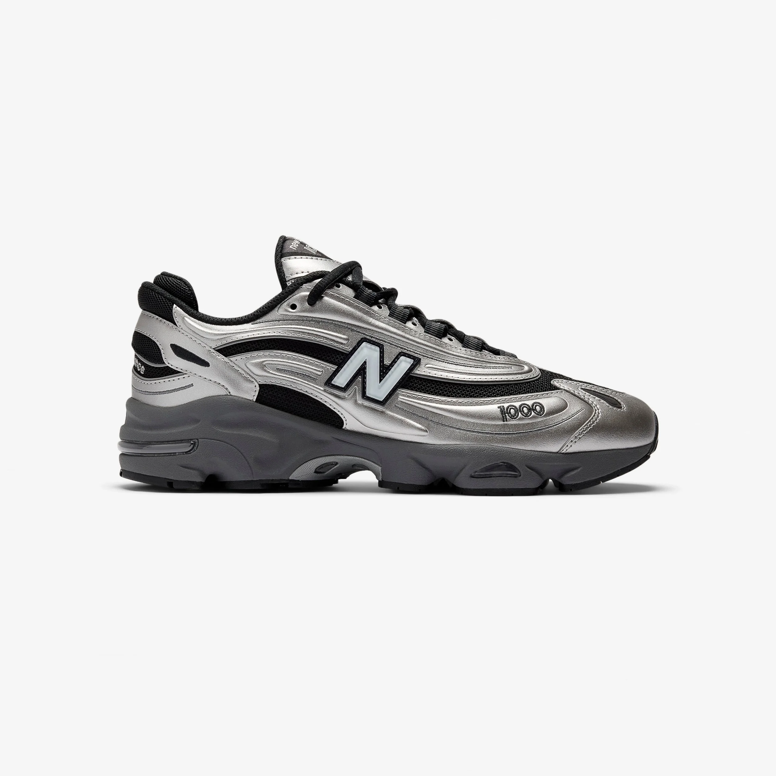 After making its long-awaited return from the archives last year, the New Balance 1000 steals the show once again with this brand-new "Black Metallic Silver" colorway. Equipped with its signature Y2K-inspired aesthetic, this edition of the NB 1000 combines a sleek metallic silver base with black accents throughout the upper, laces, and midsole, complemented by the silhouette's distinct chunky design and signature New Balance logos. - New Balance 1000 - Mesh and synthetic upper - Sculpted midsole details - Polyurethane & ABZORB midsole - ABZORB cushioning at heel and forefoot - Stability Web rubber outsole Article no: M1000EGR Gender: Unisex Color: SILVER METALLIC