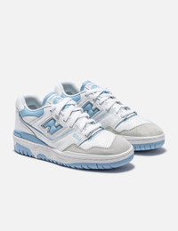 - New Balance - 550 - Leather upper with suede overlays - Lace-up closure - Perforated holes at the sides - Signature N logo on the sides - Branded tongue, heel and midsole - Padded tongue and collar - Rubber outsole - Color: White/Blue Haze/Rain Cloud - Style Code: BB550LSB - Material: Suede, Leather, Rubber - See more Sneakers and Shoes
