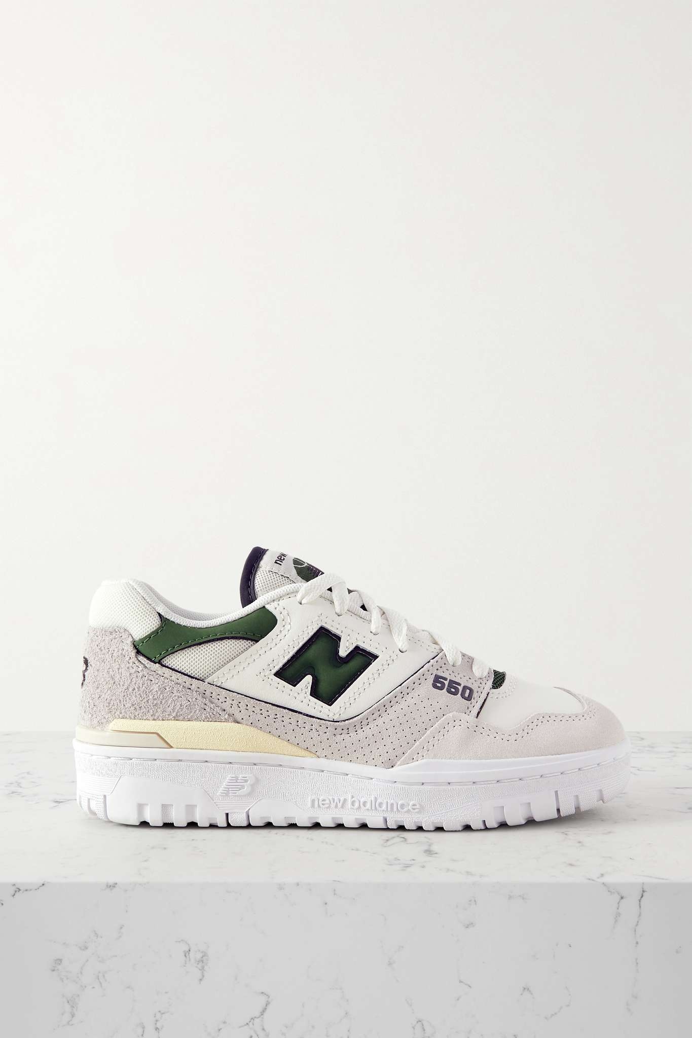 EDITORS'NOTES This version of New Balance's basketball-inspired '550' sneakers is part of the brand's 'Sea Salt' collection. Made from panels of leather and mesh trimmed with suede, they have perforated panels for breathability and are set on chunky rubber soles. SIZE & FIT Fits true to size, please refer to New Balance size guide below: - US 5 = UK 3/ EU 35 - US 5.5 = UK 3.5/ EU 36 - US 6 = UK 4/ EU 36.5 - US 6.5 = UK 4.5/ EU 37 - US 7 = UK 5/ EU 37.5 - US 7.5 = UK 5.5/ EU 38 - US 8 = UK 6/ EU 39 - US 8.5 = UK 6.5/ EU 40 - US 9 = UK 7/ EU 40.5 - US 9.5 = UK 7.5/ EU 41 - US 10 = UK 8/ EU 41.5 - US 10.5 = UK 8.5/ EU 42.5 - US 11 = UK 9/ EU 43 - US 11.5 = UK 9.5/ EU 43.5 - US 12 = UK 10/ EU 44 - US 12.5 = UK 10.5/ EU 45 - US 13 = UK 11/ EU 45.5 - US 13.5 = UK 11.5/ EU 46 - US 14 = UK 12/ EU 46.5 DETAILS & CARE - Rubber sole measures approximately 20mm/ 1 inch - White and green leather (Pig), off-white mesh, light-gray and pastel-yellow suede (Pig) - Lace-up front - New Balance follows its own size guide, therefore the size stated on the box will differ from the one provided in our size chart. To receive your correct fit, please refer to Size & Fit notes
