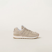 Presented for the Spring Summer 2022 fashion show, this exclusive shoe is the result of a collaboration between Miu Miu and New Balance. A hybrid design, this sports shoe is entirely reinterpreted in denim with raw-cut frayed edges, part of a construction process exposed to underline the spontaneity of these actions. - Product code: 5E765D_CSL_F0044_F_015 - Upper with frayed edges - Fabric lining - Screen-printed logo on the tongue, back, and insole - Laces closure - 25 mm rubber sole - Removable fabric-covered insole - Imported