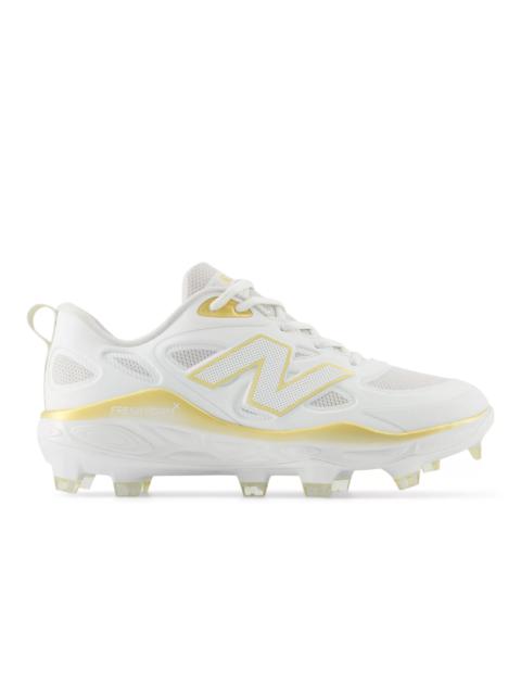 Derived from athlete feedback, the Fresh Foam Velo v4 Molded softball cleats are designed for high performance and comfort on the diamond. For pitchers with excessive toe drag, we recommend using a toe-protection product to extend the life of your cleats. Features - Fresh Foam midsole cushioning is precision engineered to deliver an ultra-cushioned, lightweight ride - TPU molded cleat outsole provides superior traction on both turf and natural surfaces - Finished with metallic gold detailing to represent the gold standard of comfort delivered by New Balance Material - Breathable and durable synthetic and mesh upper Style #: SPVELOC4