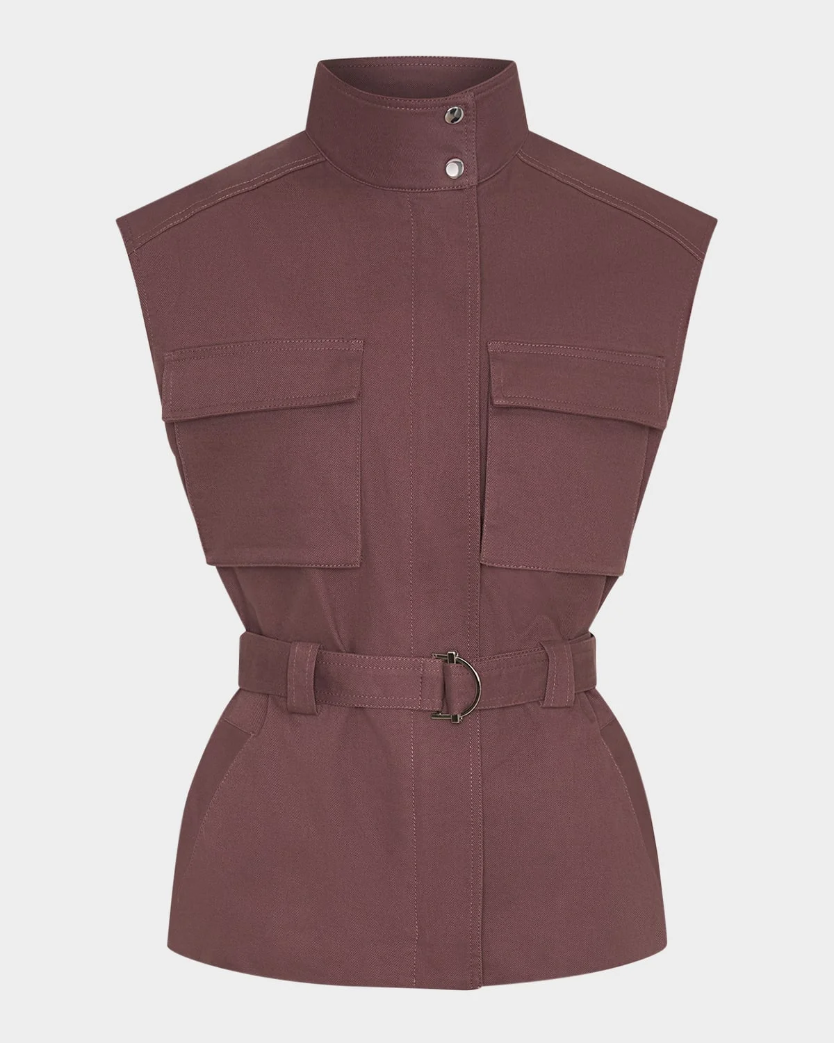 NICHOLAS "Danna" cottonblend vest finished with tonal topstitching and a cinching Dring belt Approx. 28"L from shoulders to hem Stand collar; snap front Sleeveless Chest flap patch pockets Side slant welt pockets Center back vent Relaxed fit Cotton/spandex Dry clean Imported