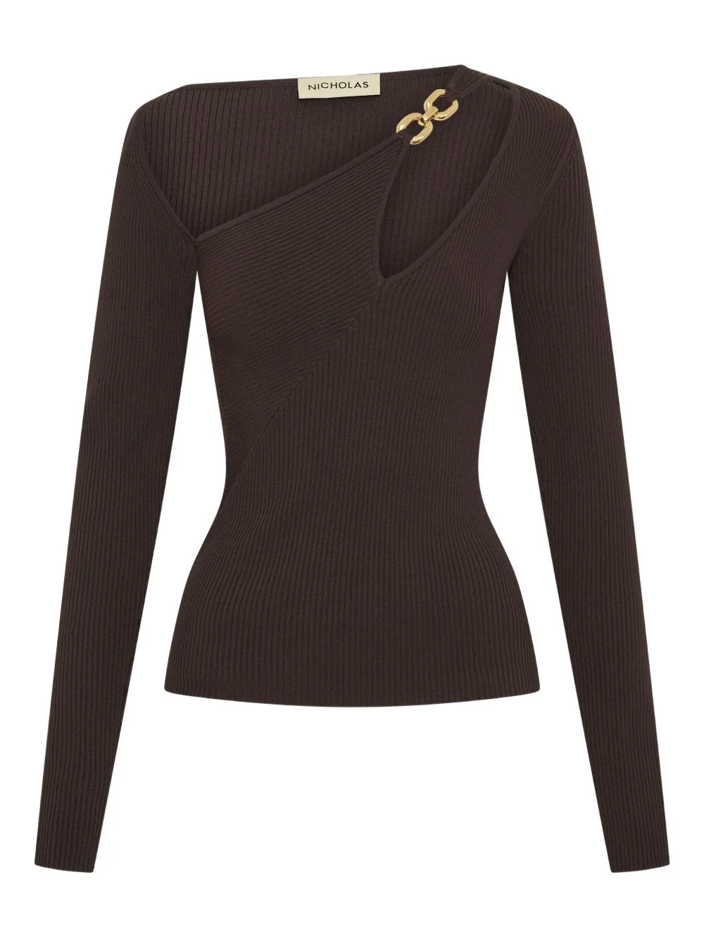 Falda cut-out ribbed top Highlights - Cacao - Ribbed knit - Cut-out detail - Long sleeves - Gold-tone embellishment Imported Composition Rayon 65%, Nylon 35% Washing instructions Read Manufacturer Guidelines
