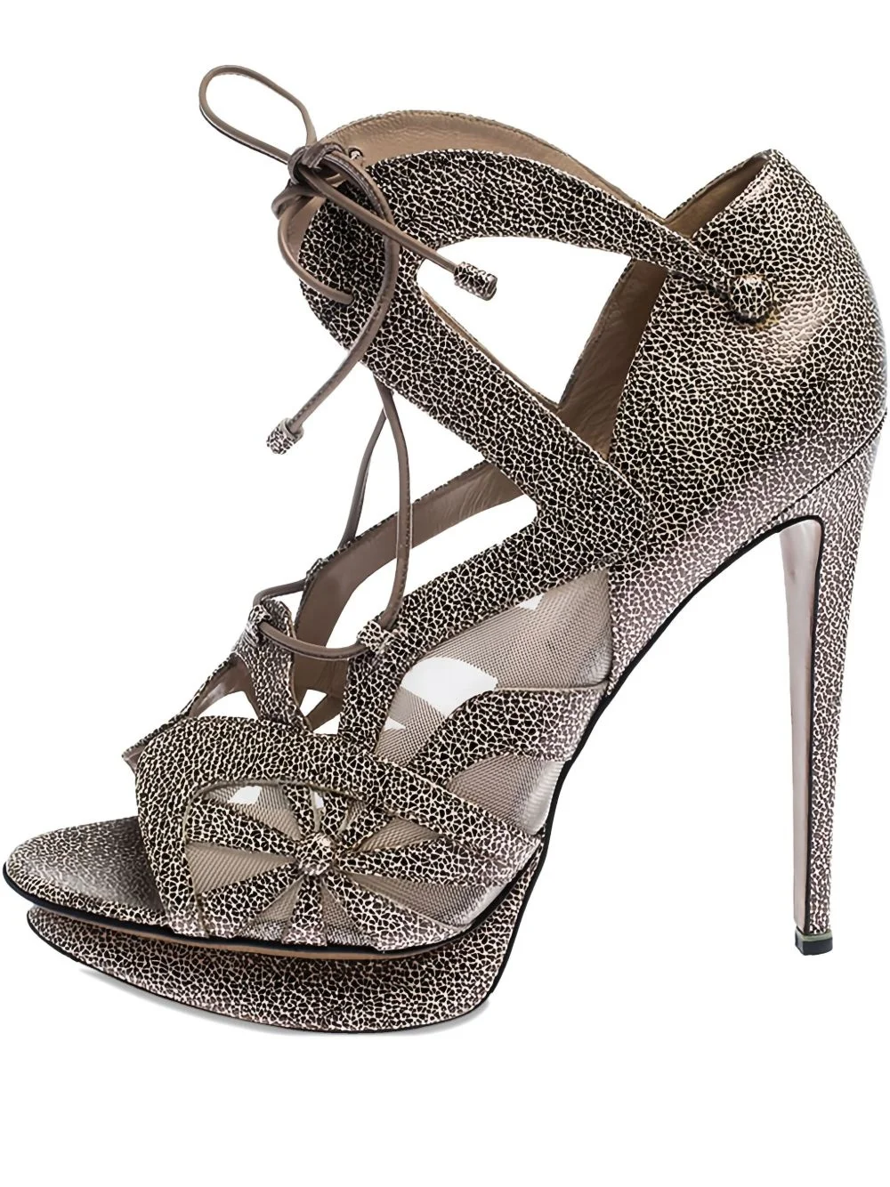 leather platform sandals Highlights - Black - Metallic - Leather - Mesh paneling - Platform sole - Lace-up detail - Cut-out detailing - High heel - Condition: good. this previously owned and used item is in good condition with minimal signs of use. this may include fading of material or plating and scratches. Made in Italy Composition Lining: Leather 100% Outer: Leather 100% Sole: Rubber 100%, Leather 100% SIZE & FIT Measurement HEEL 5.31 in(13.5 cm)