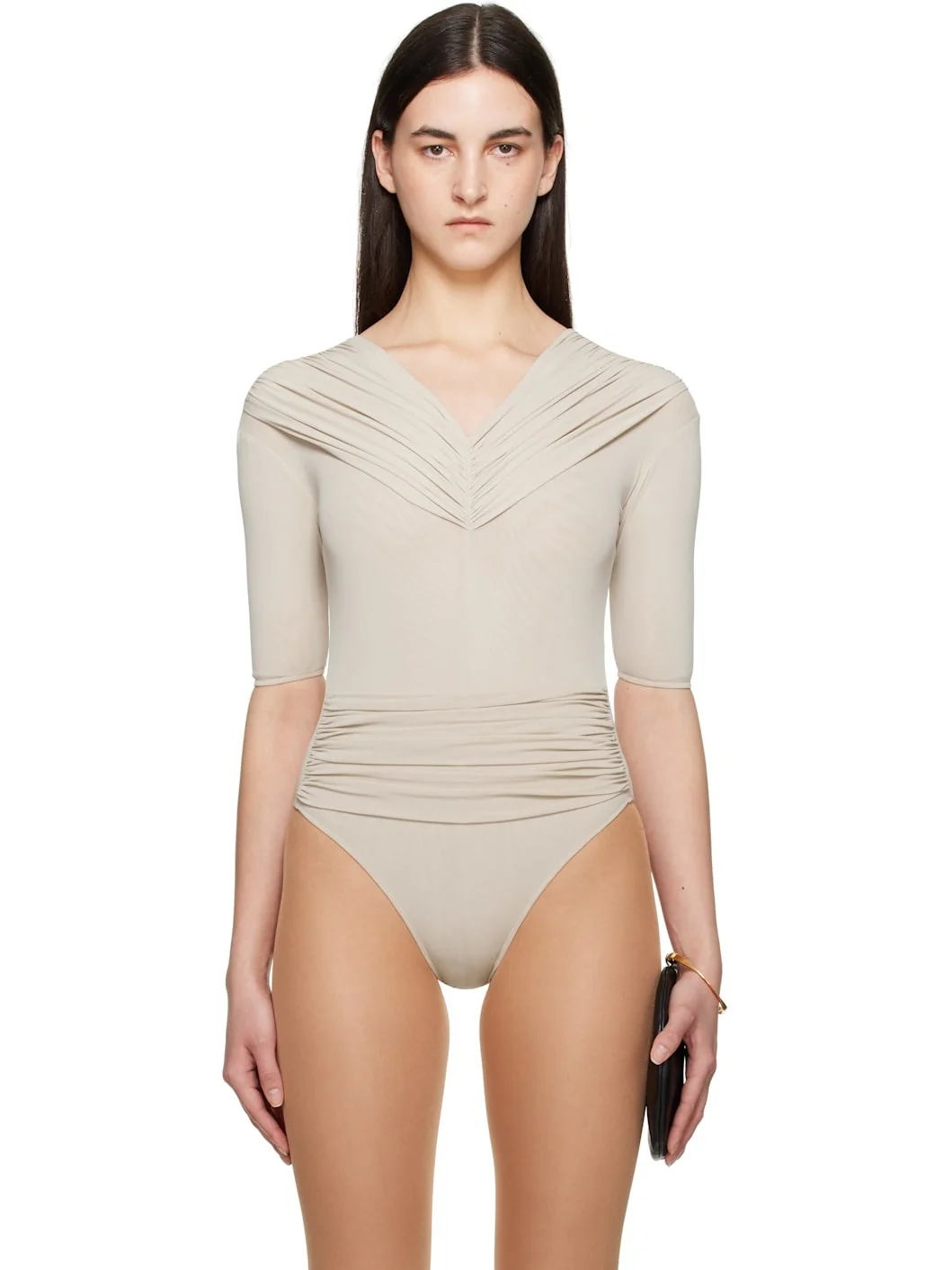 Stretch nylon mesh bodysuit. · Ruching at V-neck · Ruched panel at waist · Elasticized cuffs Supplier color: Cream 90% polyamide, 10% elastane. Made in Lithuania 251126F358002