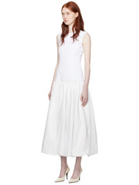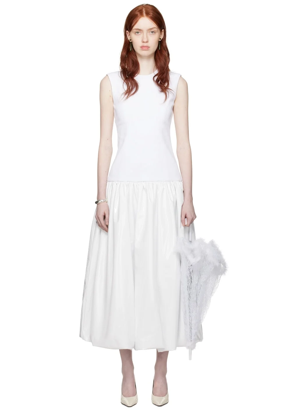 Paneled stretch denim and coated polyester jersey dress. · Round neck · Princess seams at front and back · Gathering at drop waist · Structured bubble hem · Concealed zip closure at back · Full oxford cloth lining Part of the exclusive SSENSE Bridal capsule. Supplier color: White Body 1: 97% cotton, 3% elastane. Body 2: 100% polyester. Lining: 65% polyester, 35% cotton. Made in Lithuania 242126F055000