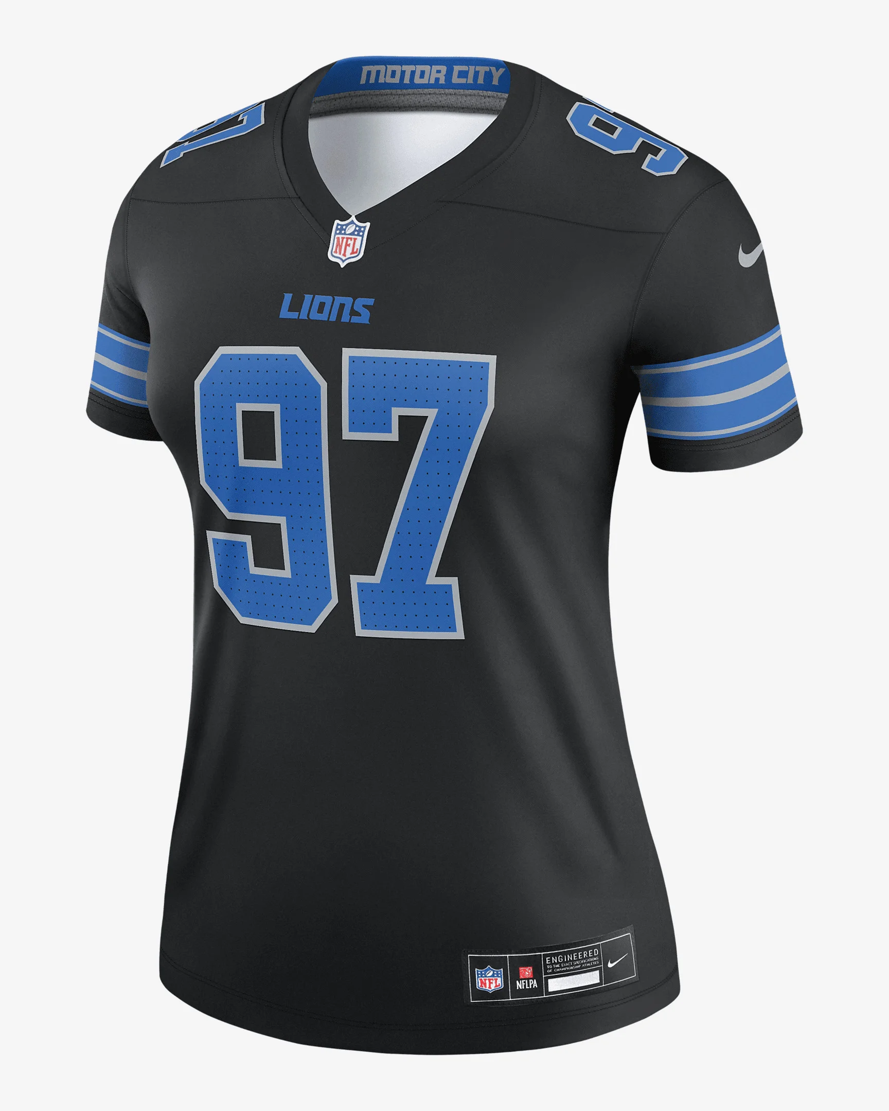 This Aidan Hutchinson Jersey delivers an authentic touch on game day with official team details and a tribute to your favorite player. Sweat-wicking technology helps provide consistent comfort as you rep the Detroit Lions. Benefits - Nike Dri-FIT technology moves sweat away from your skin for quicker evaporation, helping you stay dry and comfortable. - Fully sublimated double pique fabric helps provide lightweight comfort. Product Details - Streamlined fit NFL shield at V-neck - Tagless neck label - Woven jock tag - 100% polyester - Machine wash - Imported - Shown: Black - Style: 94NW0B9M9JF-XN0