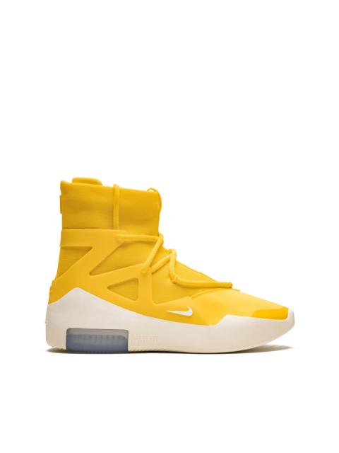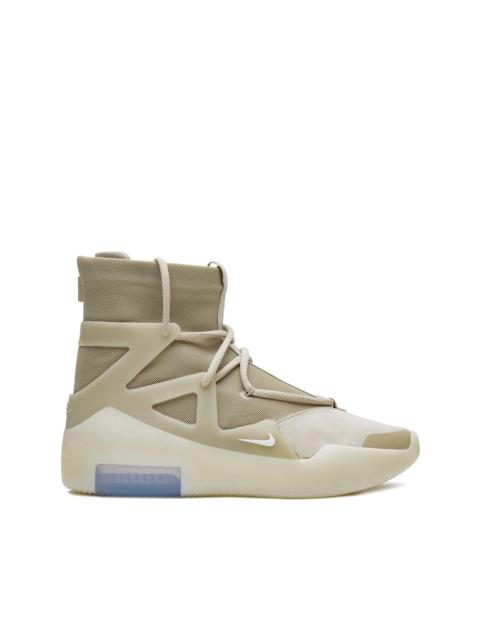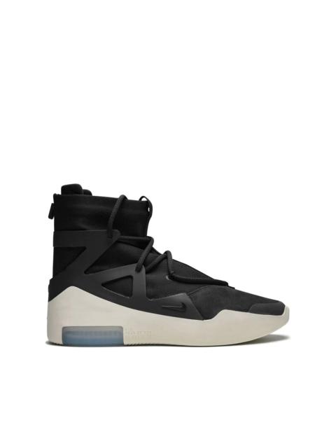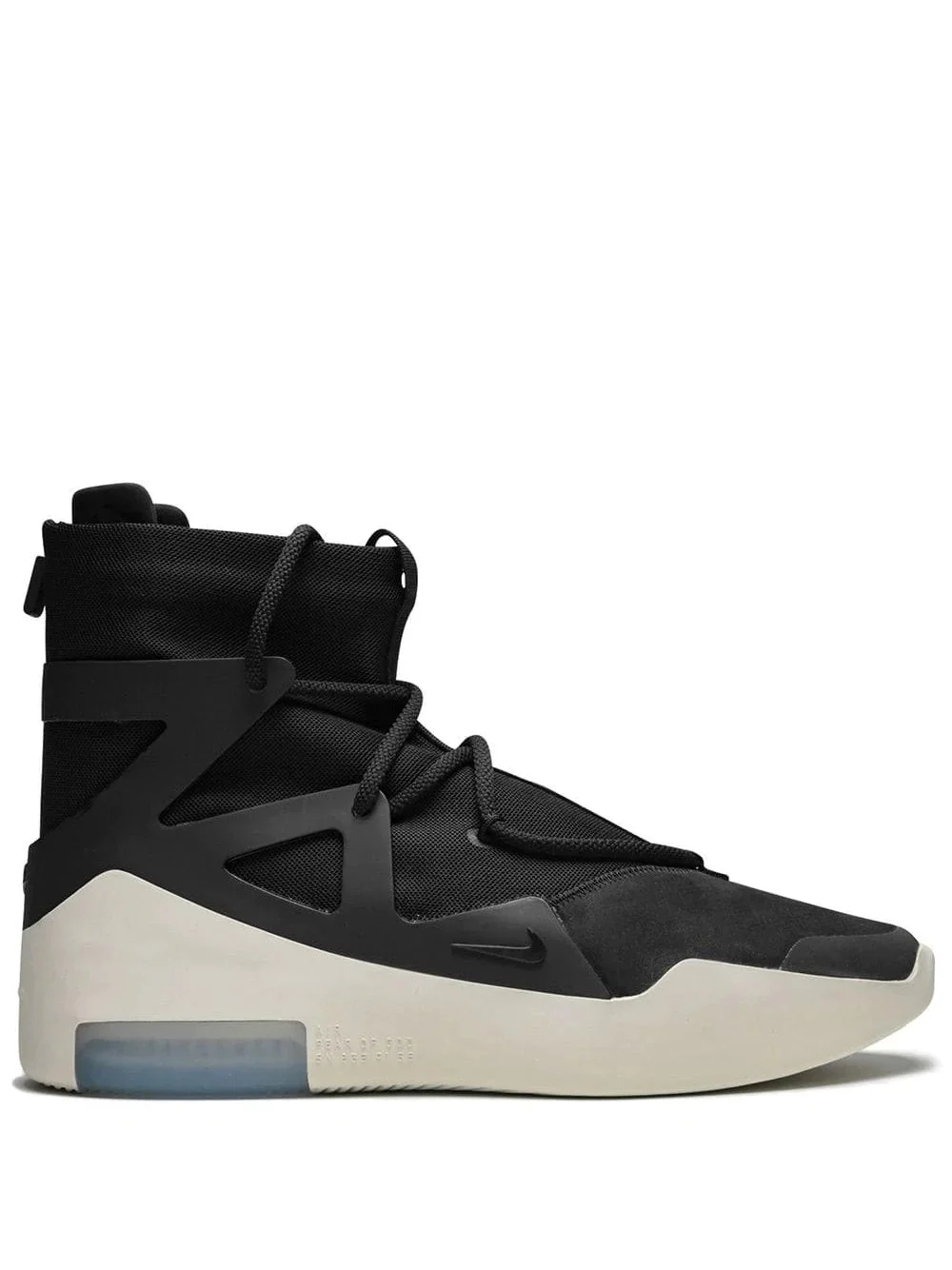 Air Fear Of God 1 "Black" sneakers Black leather and canvas Air Fear Of God 1 hi-top sneakers from Nike featuring a square toe, a lace-up front fastening, a signature Nike swoosh and a white rubber sole. Imported Composition Calf Leather 100% SIZE & FIT Measurement HEEL 5.31 in(13.5 cm) Sole height 1.96 in(5 cm) HEIGHT 6.29 in(16 cm)