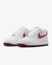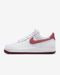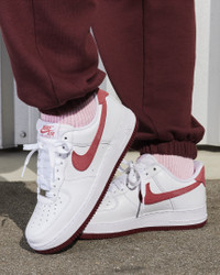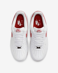 Comfortable, durable and timeless—the AF1 is a fan favorite for a reason. Classic '80s construction pairs with bold details for style that tracks whether you're on the court or on the go. And because we can't resist a tempting treat, a special Valentine's Day colorway sweetens the look. Benefits - Stitched overlays on the upper add heritage style, durability and support. - Originally designed for performance hoops, Nike Air cushioning adds lightweight, all-day comfort. - Low-cut silhouette adds a clean, streamlined look. - Padded collar feels soft and comfortable. Product Details - Foam midsole - Perforations on toe - Rubber sole - Shown: White/Team Red/Dragon Red/Adobe - Style: FQ7626-100