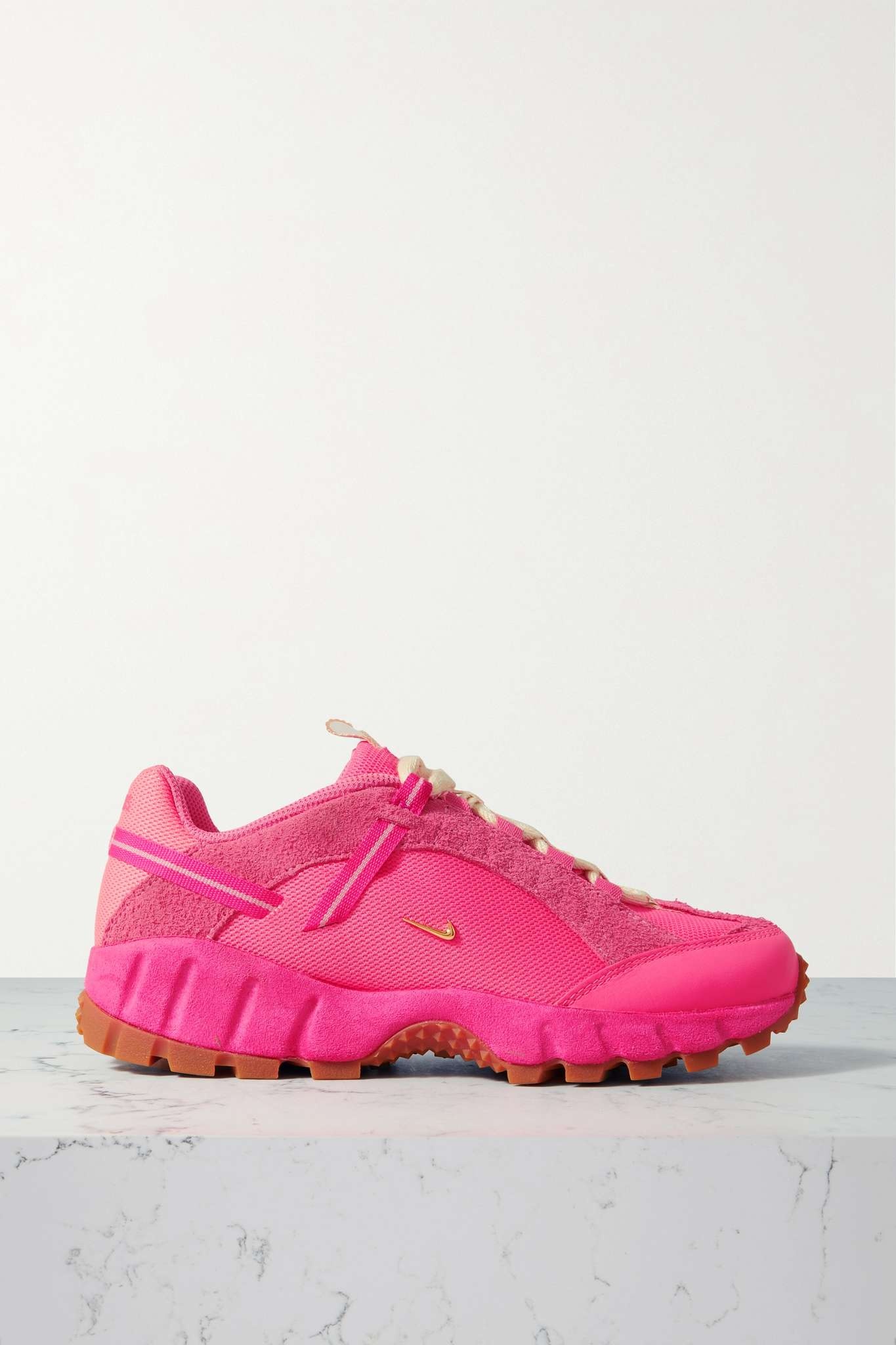 EDITORS'NOTES This hot-pink rendition of Nike x Jacquemus' 'Air Humara' sneakers recalls the runway from the French brand's 10th-anniversary show in Provence - the splash of color amongst the lavender fields is still iconic. They're made from panels of suede, mesh and leather and threaded with stripy straps that resemble slinky cutouts from Jacquemus' ready-to-wear. SIZE & FIT Nike follows its own size guide, please refer to below: - US 5 = UK 2.5/ EU 35.5 - US 5.5 = UK 3/ EU 36 - US 6 = UK 3.5/ EU 36.5 - US 6.5 = UK 4/ EU 37.5 - US 7 = UK 4.5/ EU 38 - US 7.5 = UK 5/ EU 38.5 - US 8 = UK 5.5/ EU 39 - US 8.5 = UK 6/ EU 40 - US 9 = UK 6.5/ EU 40.5 - US 9.5 = UK 7/ EU 41 - US 10 = UK 7.5/ EU 42 - US 10.5 = UK 8/ EU 42.5 - US 11 = UK 8.5/ EU 43 - US 11.5 = UK 9/ EU 44 - US 12 = UK 9.5/ EU 44.5 - Fits true to size, take your normal size DETAILS & CARE - Tonal-pink suede, leather (Cow) and mesh - Lace-up front - Designer color: Pink Flash - Nike follows its own size guide, therefore the size stated on the box will differ from the one provided in our size chart. To receive your correct fit, please refer to Size & Fit notes