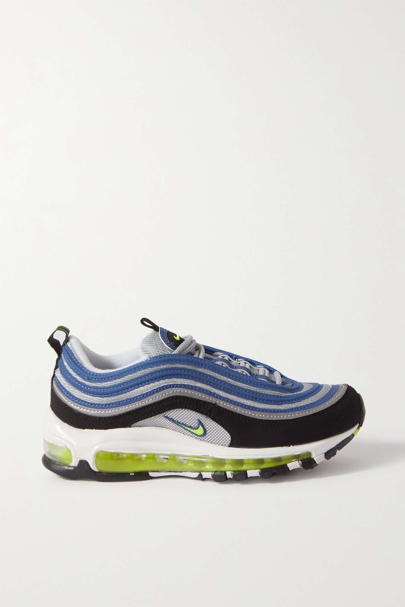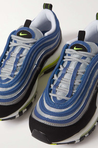 EDITORS'NOTES Nike celebrates 25 years of the 'Air Max 97' sneakers with a collection of celebratory colorways. Inspired by the Japanese bullet train, this pair combines classic black and 'Atlantic Blue' nubuck leather with iconic silver mesh panels. They’re set on a comfortable 'Air' sole, which stands out in 'Voltage Yellow'. SIZE & FIT Nike follows its own size guide, please refer to below: - US 5 = UK 2.5/ EU 35.5 - US 5.5 = UK 3/ EU 36 - US 6 = UK 3.5/ EU 36.5 - US 6.5 = UK 4/ EU 37.5 - US 7 = UK 4.5/ EU 38 - US 7.5 = UK 5/ EU 38.5 - US 8 = UK 5.5/ EU 39 - US 8.5 = UK 6/ EU 40 - US 9 = UK 6.5/ EU 40.5 - US 9.5 = UK 7/ EU 41 - US 10 = UK 7.5/ EU 42 - US 10.5 = UK 8/ EU 42.5 - US 11 = UK 8.5/ EU 43 - US 11.5 = UK 9/ EU 44 - US 12 = UK 9.5/ EU 44.5 - Fits true to size, take your normal size DETAILS & CARE - Rubber sole measures approximately 35mm/ 1.5 inches - Blue and black nubuck, silver mesh - Lace-up front - Designer color: Atlantic Blue/ Voltage Yellow - Nike follows its own size guide, therefore the size stated on the box will differ from the one provided in our size chart. To receive your correct fit, please refer to Size & Fit notes