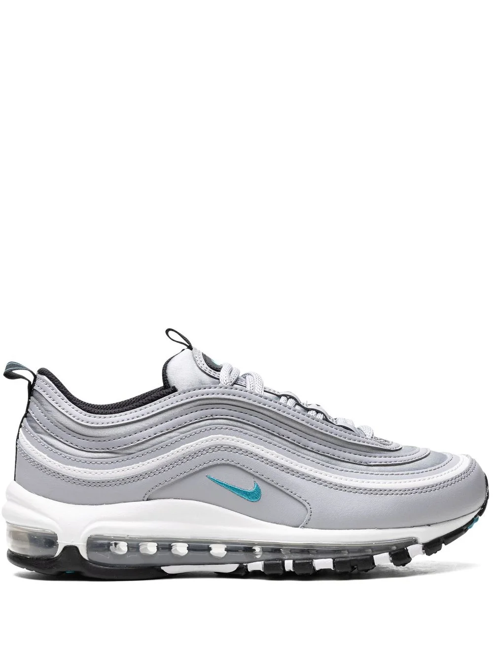 Air Max 97 "Silver Aqua" sneakers Nike's Air Max 97 sneakers are distinguished by the signature ripple-effect design — inspired by water droplets and Japanese bullet trains. This pair is seen in grey with pops of aqua blue. The signature Swoosh logo lands on the tongue, sides and sole, completing the design. Highlights - Grey/white/blue - Leather - Mesh design - Signature swoosh logo detail - Round toe - Front lace-up fastening - Logo patch at the tongue - Double pull-tab at the opening - Transparent max air sole - Rubber sole - These styles are supplied by a premium sneaker marketplace. stocking only the most sought-after footwear, they source and curate some of the most hard to find sneakers from around the world. Imported Composition Leather 100%