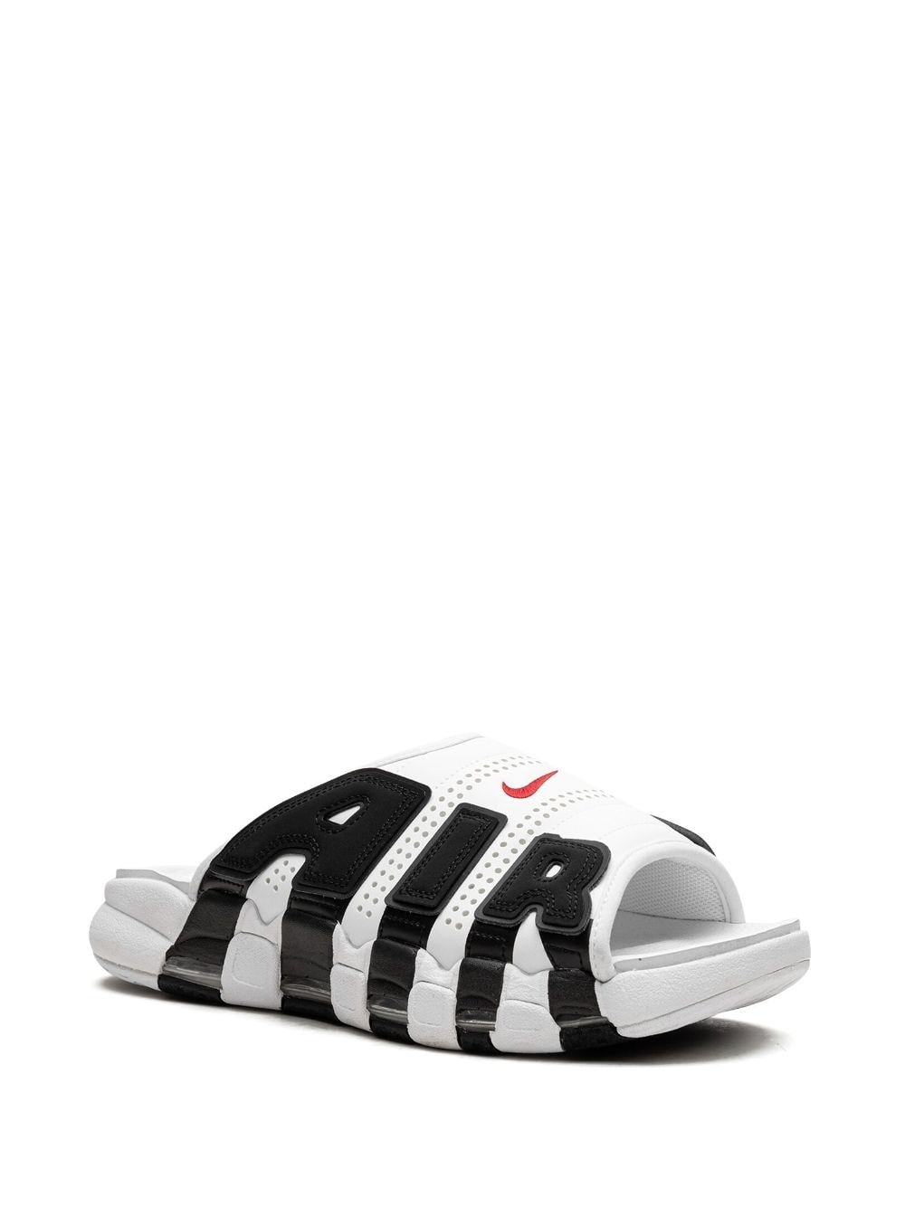 Air More Uptempo slides Just like the sneaker's version, the Nike Air More Uptempo slides are defined by a logo applique on the sides. This model is crafted from faux leather, in a monochromatic white ensemble, and sits atop a cushioned sole unit. Highlights - Black/white - Faux leather - Appliquã© logo - Perforated detailing - Open toe - Slip-on style - Branded insole - Rubber sole Imported Composition Outer: Leather 100% Sole: Rubber 100% Lining: Fabric 100%