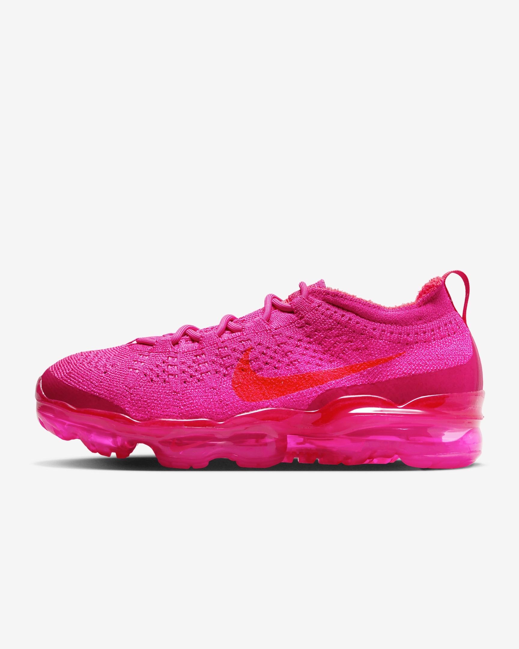 Breathe in. Breath out. This Air is better than that. With the first 1-piece Air unit to run the entire length of a shoe, the Air VaporMax 2023 Flyknit lets you walk on unbelievable cushioning. And up top, stretchy and supportive Flyknit keeps it breezy and light. Bonus—it's made with at least 20% recycled materials by weight. Now that's fresh! Benefits - As the first 1-piece Air unit to run the entire length of a shoe, it allows for smoother transitions and adds unbelievable cushioning. - Flyknit upper uses stretchy yarns for a breathable and supportive fit that feels as light as air. - Seamless collar sculpts the ankle for a sporty look that feels great, while padding on heel adds to the comfort. - Translucent rubber outsole adds durability and traction. Product Details - Traditional lacing - Shown: Fierce Pink/Fireberry/Pink Blast/Bright Crimson - Style: DV6840-600 SIZE & FIT Fits small; we recommend ordering a half size up