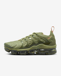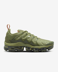 The Nike Air VaporMax Plus looks to the past to propel you into the future. With a futuristic design that nods to the '98 original, these kicks ramp up the comfort with full-length VaporMax cushioning. An olive green colorway accented with bright pops of orange adds earthy style to your look and pep to your step. Benefits - Nike VaporMax Air technology provides ultra-lightweight cushioning where you need it for optimal flexibility and comfort. - Synthetic overlays give you structure while the cushioned upper is durable and conforms to your foot. - Floating cage around the foot mimics the original '98 design. - Rubber pods in high-wear areas add durability. Product Details - Pull tab on heel - Rubber outsole - Shown: Alligator/Medium Olive/Orange Trance - Style: FD0295-300