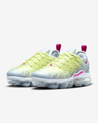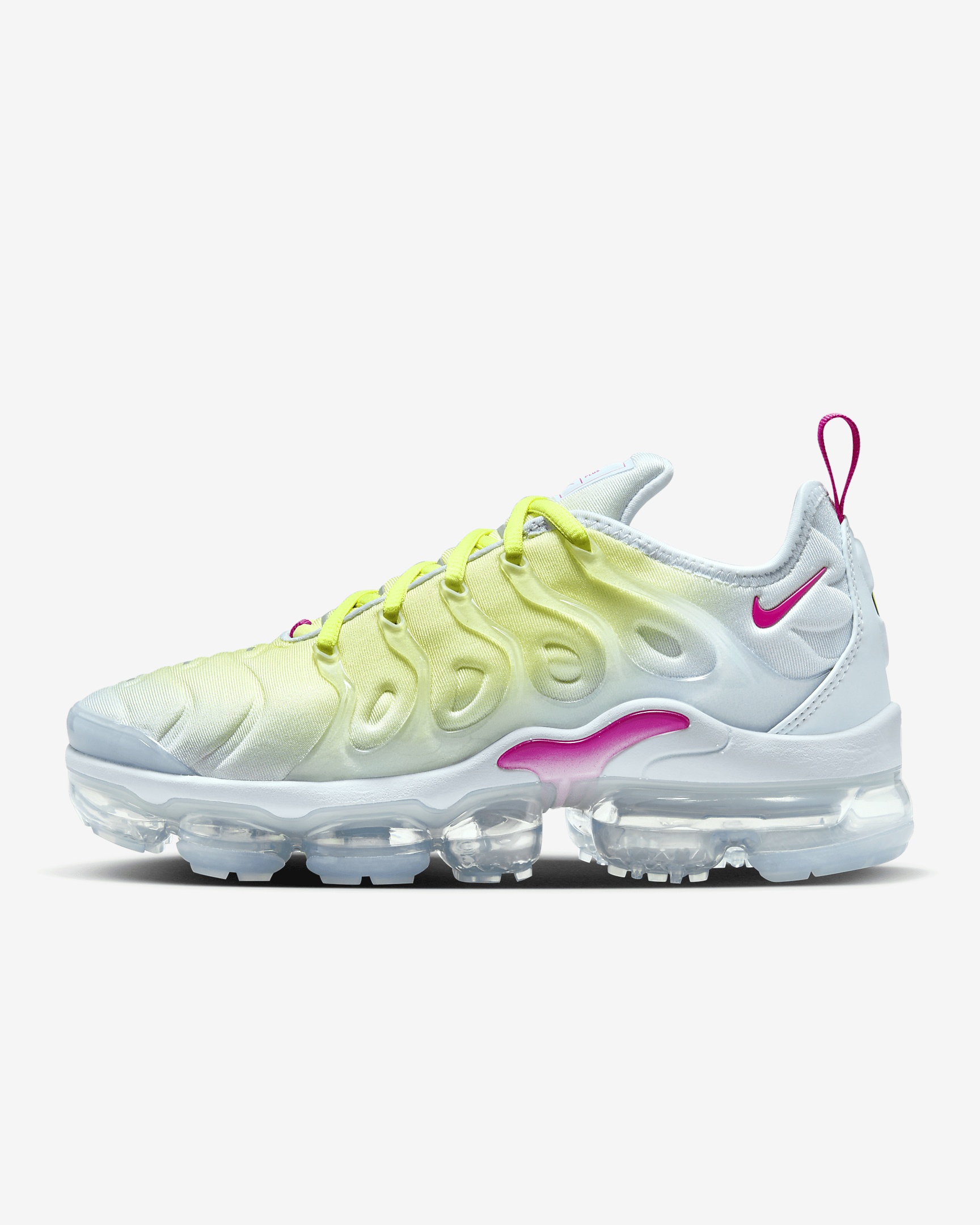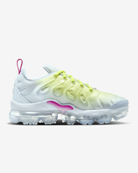 The Nike Air VaporMax Plus looks to the past to propel you into the future. Nodding to the '98 original with its floating cage and padded upper, it adds heel-to-toe VaporMax Air technology to ramp up the comfort and create a modern look. Vibrant pops of color highlight the head-turning design, helping you step into tomorrow with style. Benefits - VaporMax Air technology provides lightweight cushioning. - Floating cage around foot and whale's tail on midsole mimic beach-inspired design of Air Max Plus, adding heritage style and support. - Synthetic upper adds lightweight comfort and durability. - Rubber pods in high-wear areas add traction and durability. Product Details - Reflective details - Not intended for use as Personal Protective Equipment (PPE) - Shown: Blue Tint/Light Lemon Twist/Metallic Silver/Fireberry - Style: FQ8882-423