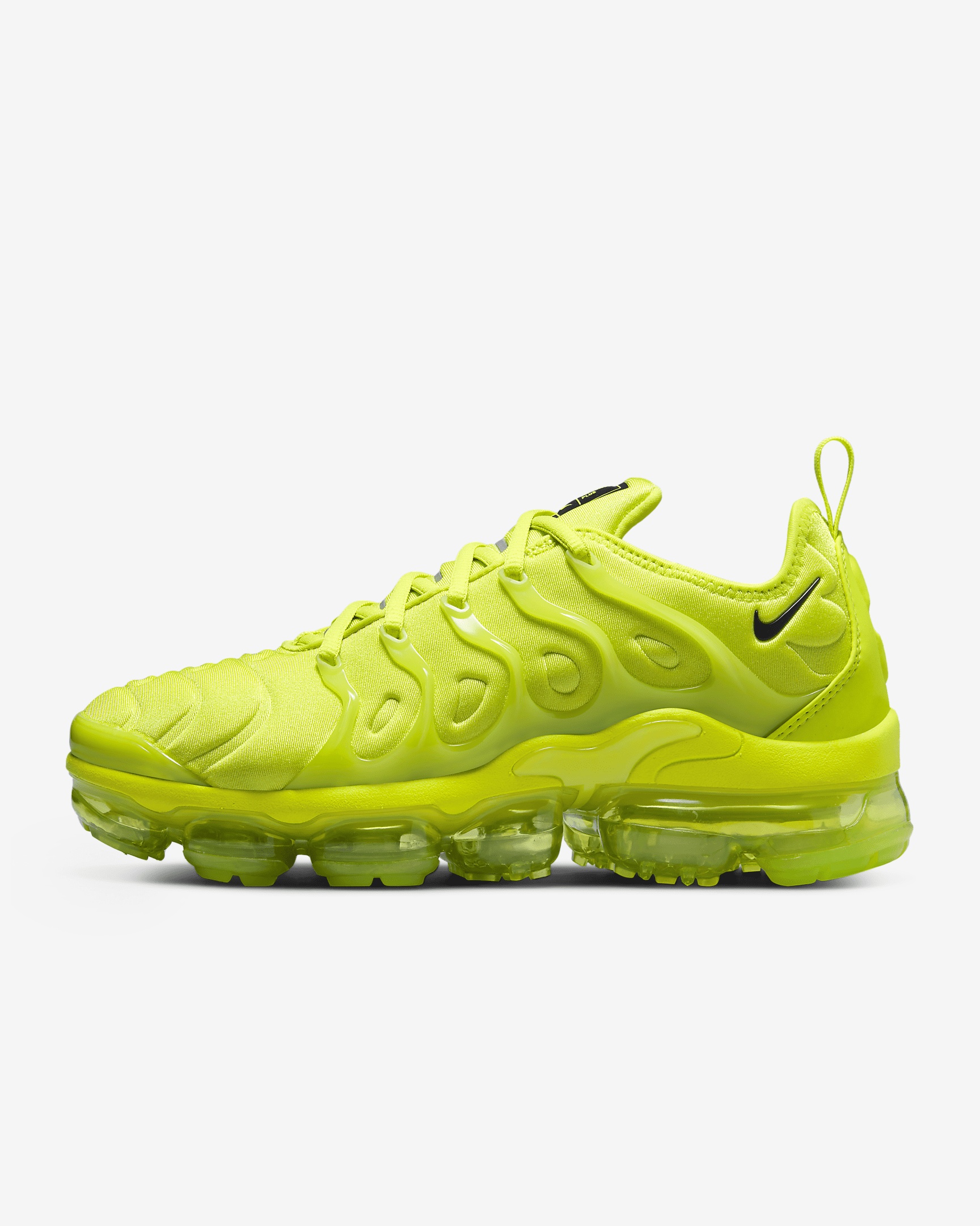 The Nike Air VaporMax Plus looks to the past to propel you into the future. With a design that nods to the futuristic '98 Air Max Plus, it adds revolutionary VaporMax Air technology to ramp up the comfort. The modern, monochromatic colorway will have others green with envy. Benefits - VaporMax Air technology provides ultra lightweight cushioning. - Floating cage around the foot mimics the original '98 design. - Cushioned fabric and synthetic material along the upper provide durability. - Rubber pods in high-wear areas of the outsole help add durability. Product Details - Pull tab on heel - Reflective elements - Not intended for use as Personal Protective Equipment (PPE) - Shown: Atomic Green/Black - Style: DX1784-300