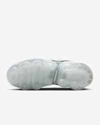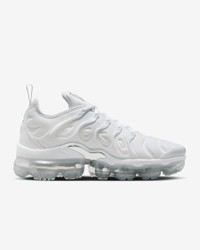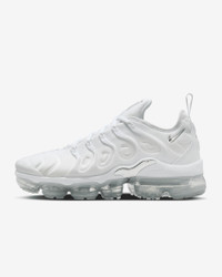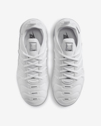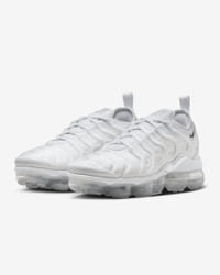 The Nike Air VaporMax Plus looks to the past to propel you into the future. Nodding to the '98 original with its floating cage and padded upper, it adds heel-to-toe VaporMax Air technology to ramp up the comfort and create a modern look. Pops of metallic silver against the white upper highlight the head-turning design, helping you walk into tomorrow with style. Benefits - Bringing beach life to the city, prominent arch draws inspiration from whale's tail and adds structure. - Floating plastic cage on upper mimics beach-inspired design of Air Max Plus to root these sneakers in heritage Nike style. - VaporMax Air technology provides ultra lightweight cushioning. - Synthetic upper adds lightweight comfort and durability. - Rubber pods in high-wear areas of outsole help add traction and durability. Product Details - Pull tab on heel - Foam midsole - Shown: White/Metallic Silver - Style: FQ8895-100 SIZE & FIT Fits small; we recommend ordering a half size up