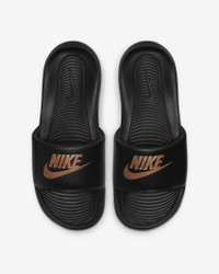From the beach to gardening to sitting on the couch, the Nike Victori One perfects a classic design. Delivering lightweight comfort that’s easy to wear, it features new softer, more responsive foam. The contoured grip pattern helps cradle and hold your foot in place. Benefits - The new, softer foam and mechanical cushioning adds unbelievable responsiveness and comfort that lasts. - The contoured footbed cradles and supports your foot while its grip pattern helps keep your foot in place. - The rolled top edge of the strap adds to the comfort while its thick padding feels soft. - The new strap design adds additional space, accommodating more foot sizes. - The outsole features a new pattern for added traction. Product Details - Bold "NIKE" and Swoosh designs on the strap lets you rep your brand - Shown: Black/Black/Metallic Red Bronze - Style: CN9677-001