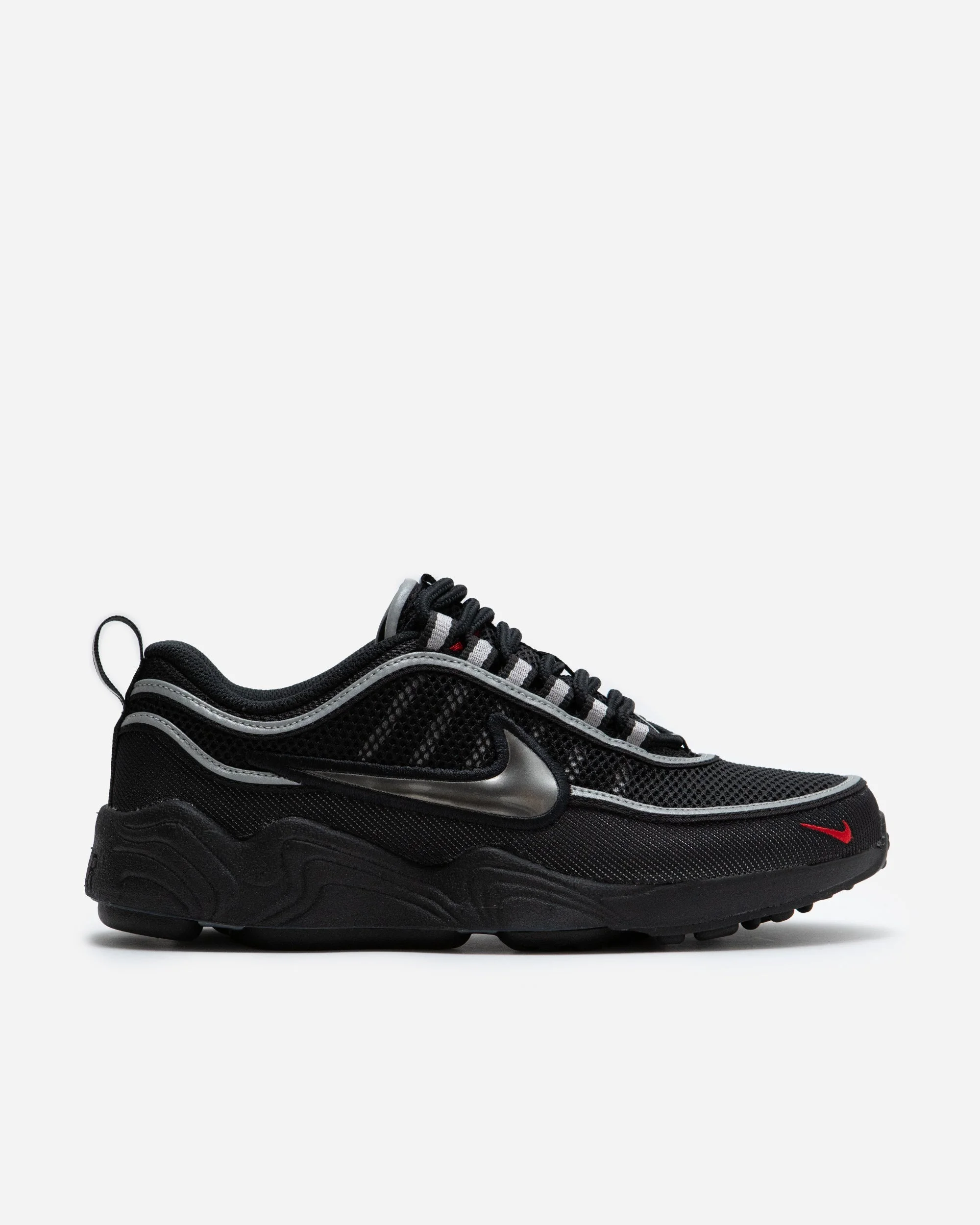 The Nike Air Zoom Spiridon brings bold 90s energy into the present with a retro-inspired Sport Red and Metallic Silver colorway. Designed with a sleek, breathable mesh upper and metallic overlays, it delivers standout style rooted in Nike's heritage. The lightweight build is paired with responsive Zoom Air cushioning, ensuring comfort whether you're hitting the streets or keeping it casual. With its dynamic silhouette and rich running legacy, the Spiridon is perfect for sneaker enthusiasts who value performance-driven design and vintage flair. Make it yours now at NAKED Copenhagen. Size & Fit: We recommend you size up a half size Sizing: UNISEX Article Number: HF9117-002 Product color: BLACK/BLACK-METALLIC SILVER