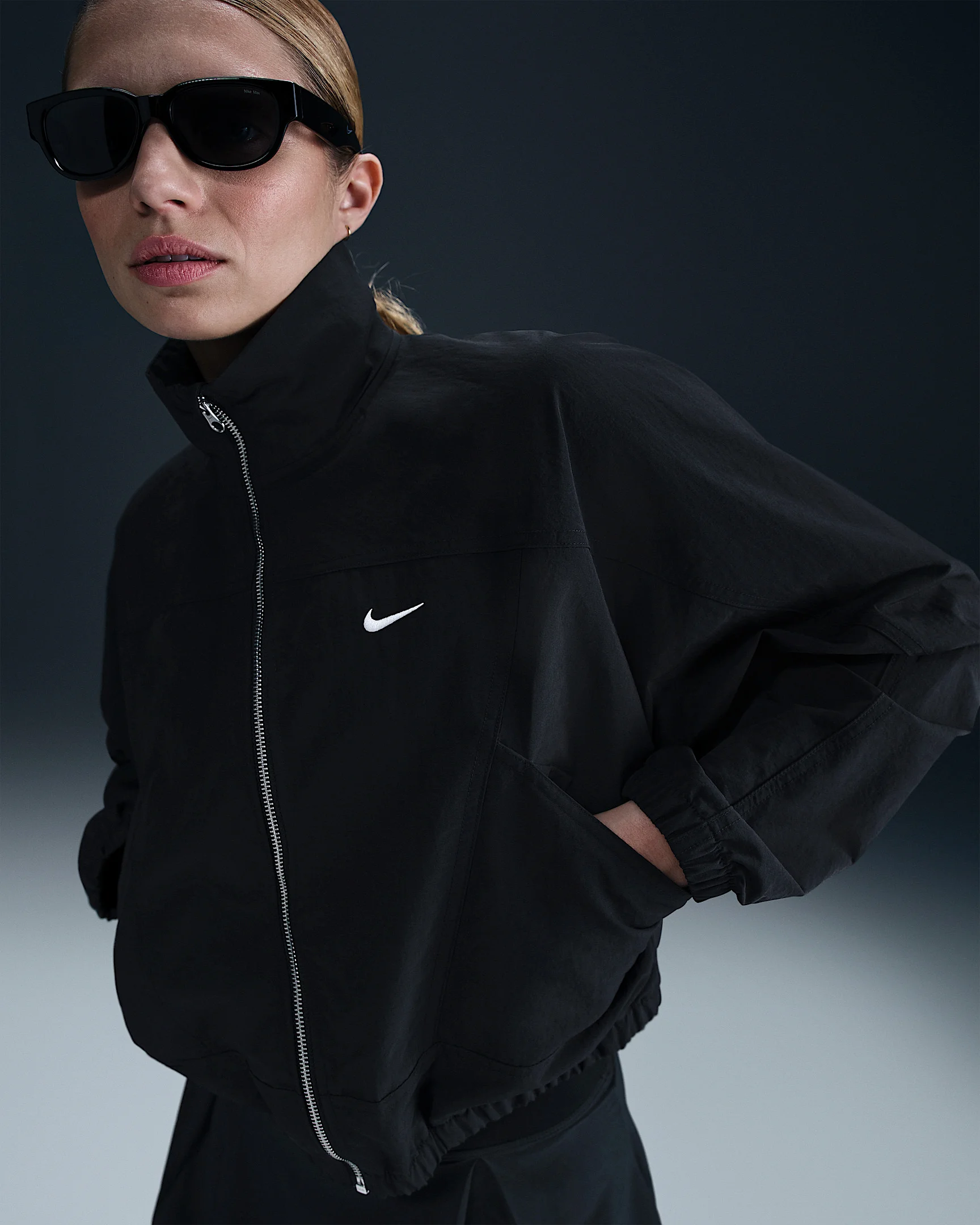 Simplicity and functionality come together in this lightweight jacket. Textured, water-repellent nylon and an elongated collar help keep you covered come rain or shine. Angled seams and a cropped length add dimension to the oversized fit. Benefits - Water-repellent finish helps keep you dry in wet weather. - Oversized fit makes layering easy. Product Details - 100% nylon - This product provides UVA and UVB protection from the sun only in the areas covered by the garment. To protect exposed areas, the use of good quality sunscreen is recommended. - Silver metal zipper - Side-seam pockets - Elastic at cuffs and hem - Embroidered Swoosh logo on left chest - Machine wash - Imported - Shown: Black/White - Style: HJ0999-010 SIZE & FIT Model is wearing size S and is 5′10″178cm Oversized fit: exaggerated and spacious
