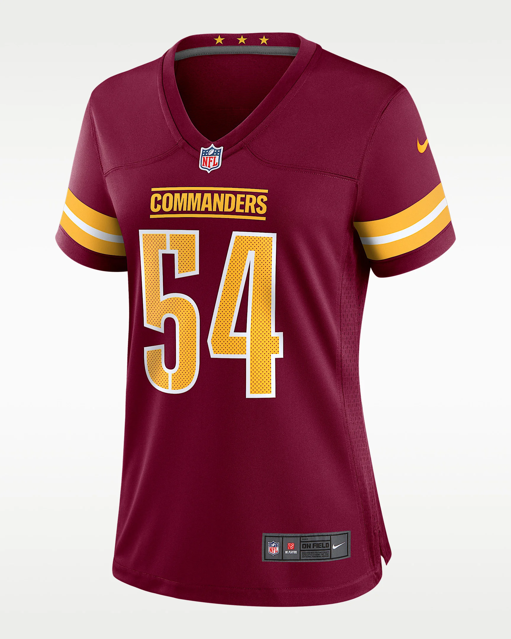 Rep one of your team's top stars with this Washington Commanders Jersey. Proper ventilation and a form fit help provide a dry, comfortable wear with the authentic look of the on-field uniform. Benefits - Screen-printed name, number and team mark offer lightweight durability. - Ventilation over major heat zones helps keep you cool. Product Details - Standard fit for a relaxed, easy feel - NFL shield at V-neck - Tagless neck label - Woven jock tag - 100% polyester - Machine wash - Imported - Shown: Team Red - Style: 67NWWSGH9EF-NZ4