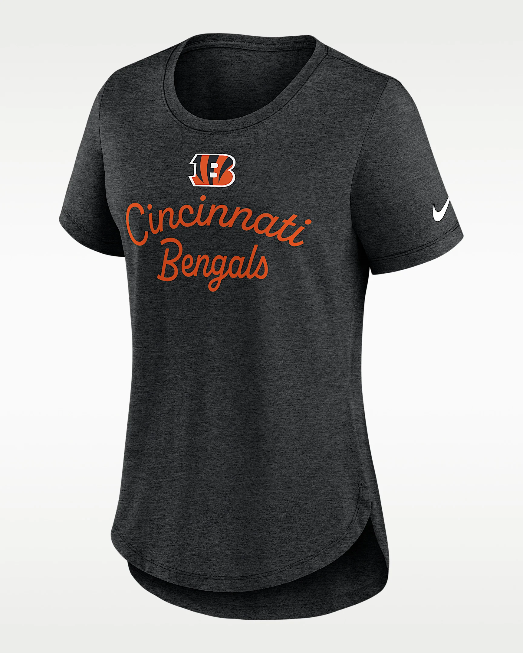 Made with soft tri-blend material, this Cincinnati Bengals Script T-Shirt features a heathered design that accentuates the team details to help you comfortably support your favorite NFL squad. Product Details - Drop-tail hem - 50% polyester/25% cotton/25% rayon - Machine wash - Imported - Shown: Black - Style: NKMV00H9A-EVH