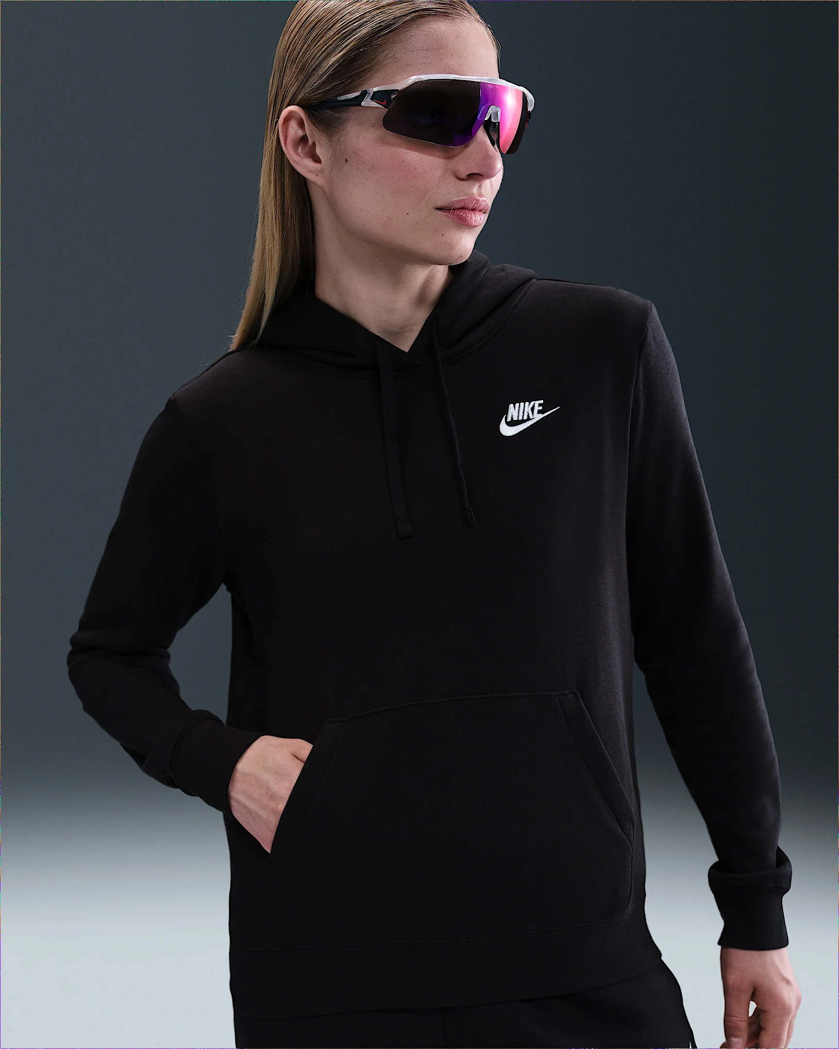 Club Fleece sweatshirts, universally loved for their coziness and consistency, are for everyone. A cold-weather essential, this easy-to-layer hoodie is a go-to whether you're pairing it with your favorite jacket or wearing it around the house. Benefits - Our best-selling fleece for a reason, Club Fleece has a cozy, familiar feel and consistent fit you can return to again and again. Brushed for added warmth and softness, it’s an ideal layer for colder temperatures. - Ribbed cuffs and hem help keep the hoodie in place while you move. - Jersey-lined 3-panel hood feels soft and smooth. Product Details - Body: 80% cotton/20% polyester. Hood Lining: 100% cotton. - Embroidered Futura logo - Machine wash - Imported - Shown: Black/White - Style: DQ5793-010 SIZE & FIT Model is wearing size S and is 5′11″180cm Standard fit: easy and traditional